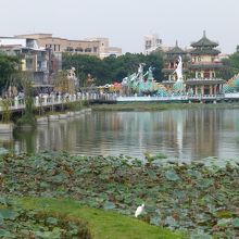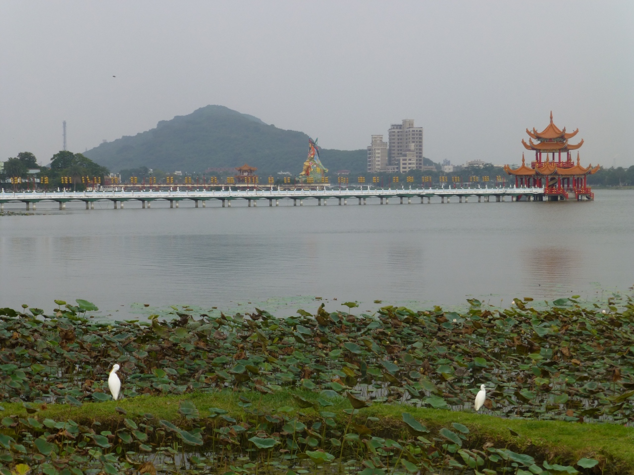 `台湾温泉ツアー`で高雄は`蓮池潭(二つの塔と池の周り)`だけでした。池には 沢山の`蓮`と`白鷺(シラサギ)`がいました。のんびりと人目を気にしないで?餌を捜しでいる様でした。観光客で混んでいましたが、`蓮・白鷺`と`周囲の建屋`で良い雰囲気でした。また高雄中心で来ます。