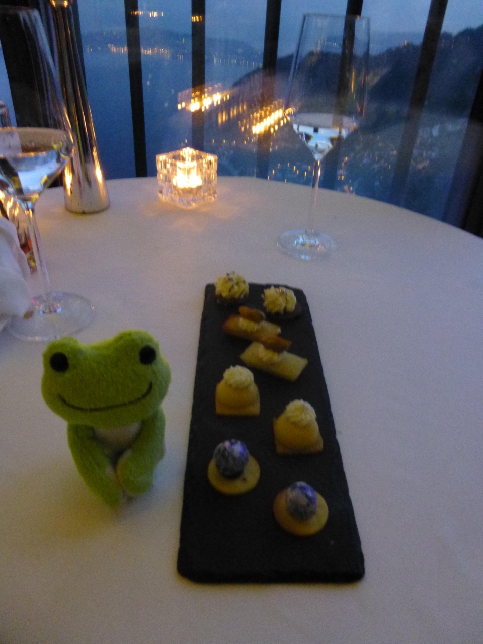 味はもちろん(お肉がやわらかいのに弾力があっておいしい!ふんだんに削りかけられたトリフの香りも最高)、だんだんと暮れていく地中海、終える頃には夜景まで満喫できる、大満足なディナーでした。