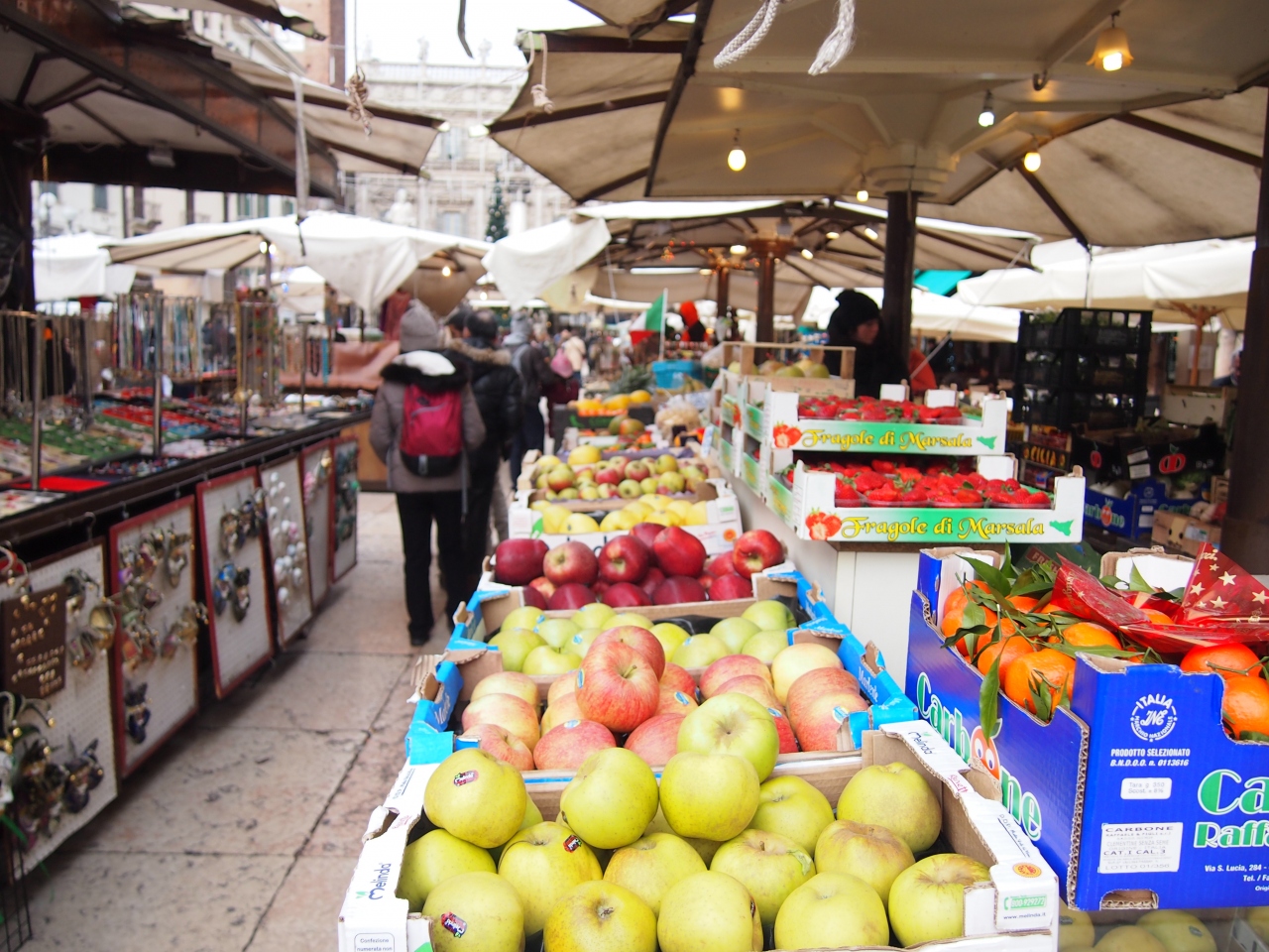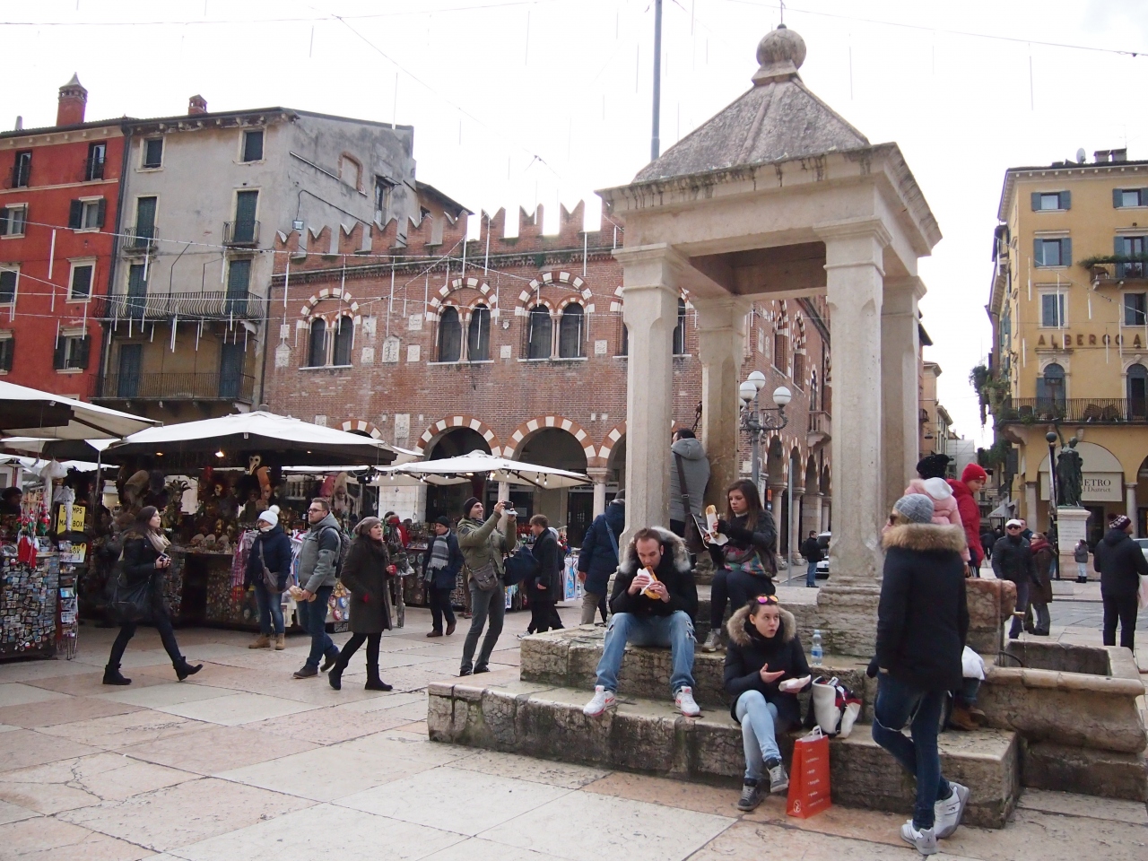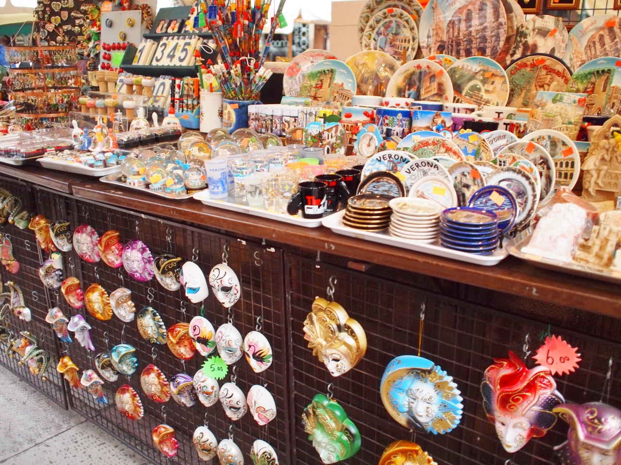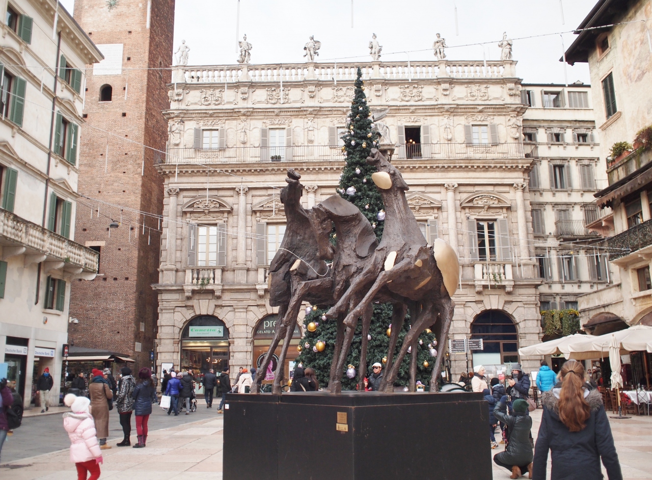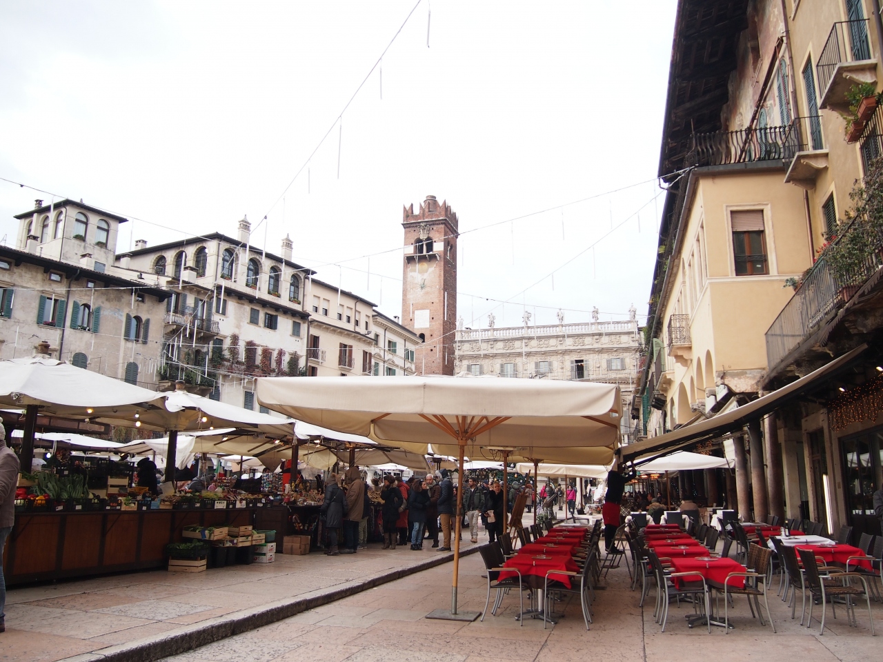 ジュリエッタの家からも近く、ランベルディの塔や多くの歴史的な建物に囲まれているけれど、多くの露店で賑わっていて、開放感のある広場です。土産物屋の露店を覗くと、ヴェネツィアと同じような仮面も売られていますが、こちらの方が値段が安いようでした。広場には聖マルコの獅子があるなど、ヴェネツィアに支配された歴史を物語っていました。