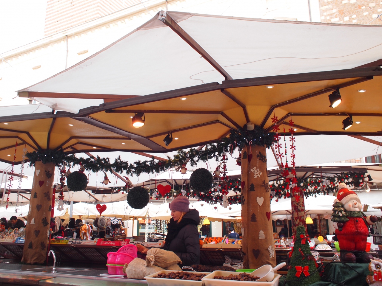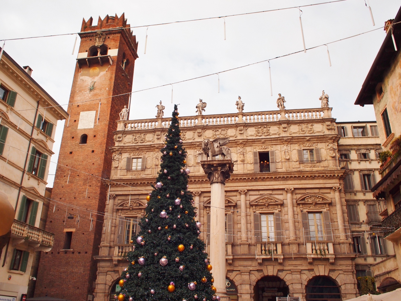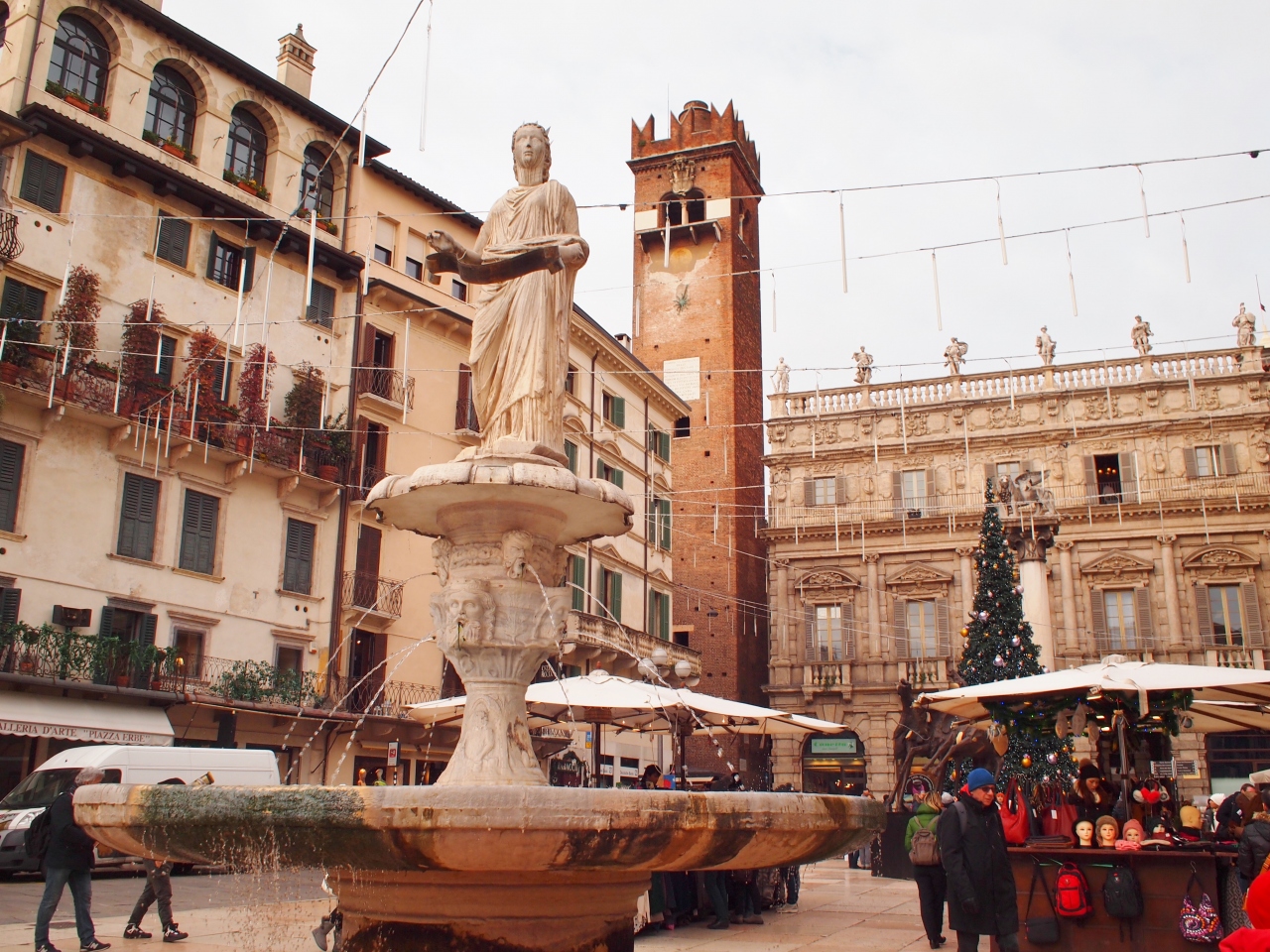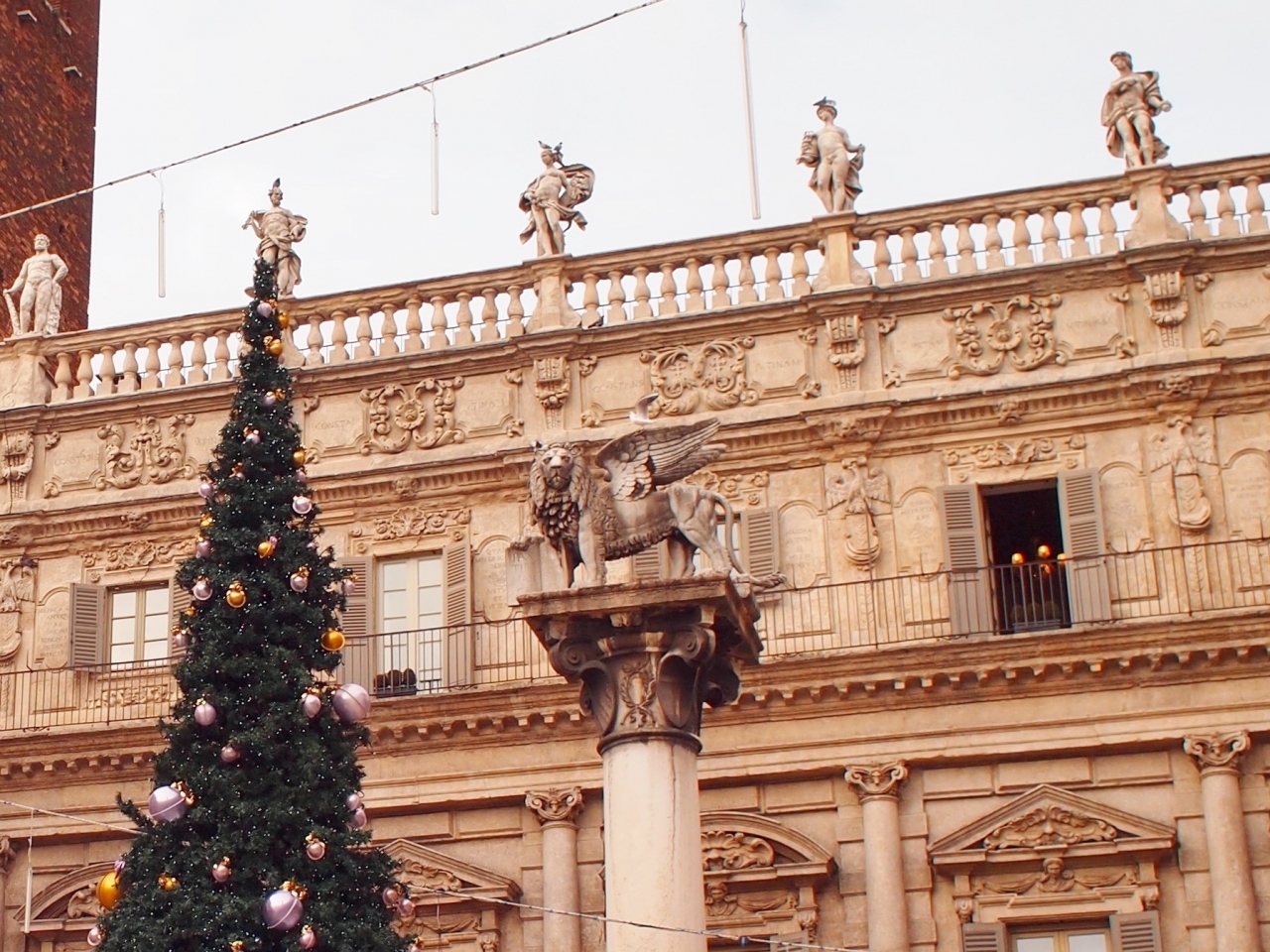 ジュリエッタの家からも近く、ランベルディの塔や多くの歴史的な建物に囲まれているけれど、多くの露店で賑わっていて、開放感のある広場です。土産物屋の露店を覗くと、ヴェネツィアと同じような仮面も売られていますが、こちらの方が値段が安いようでした。広場には聖マルコの獅子があるなど、ヴェネツィアに支配された歴史を物語っていました。