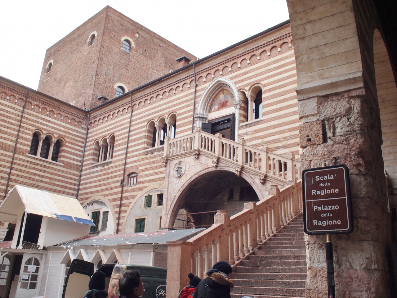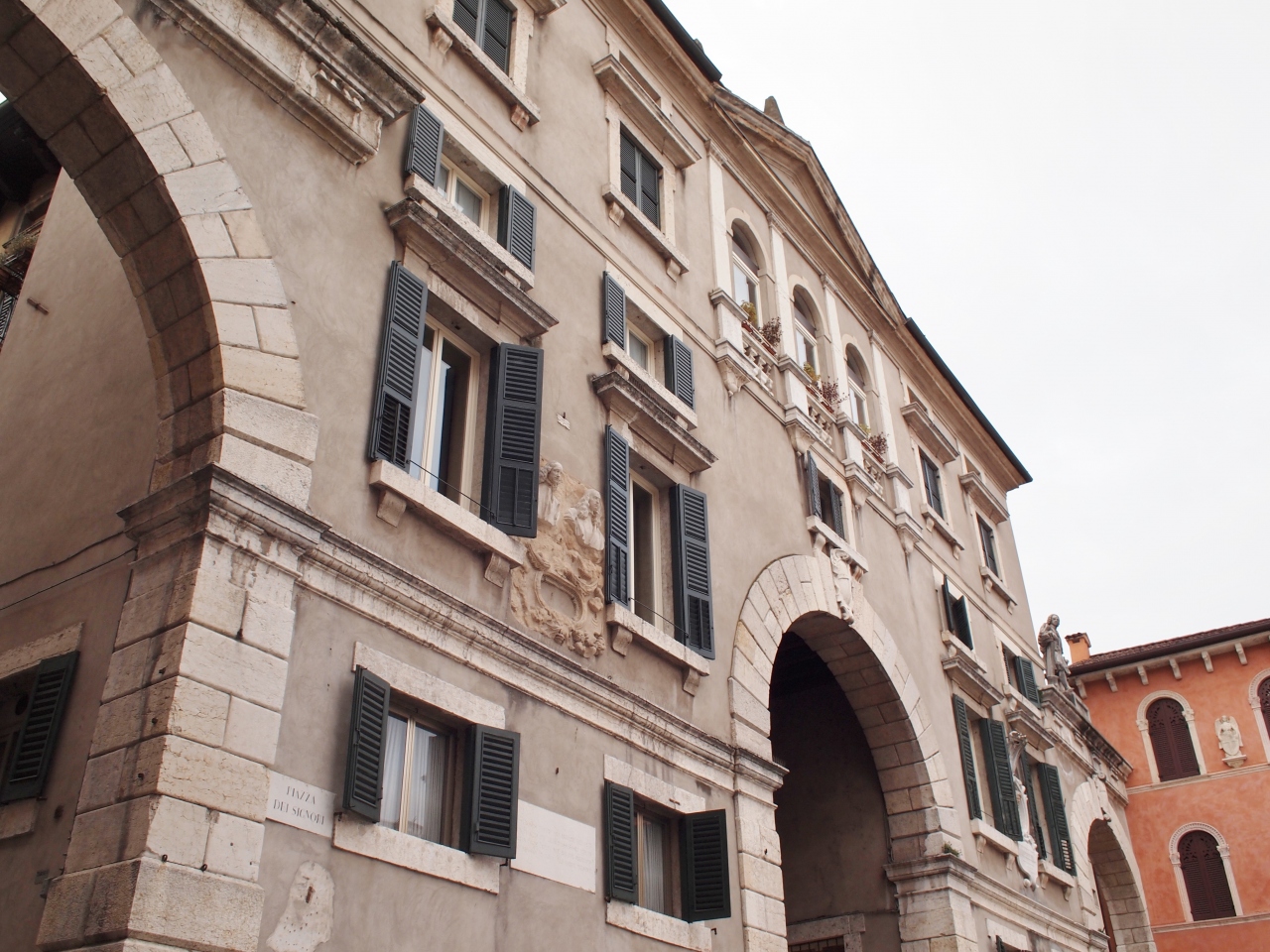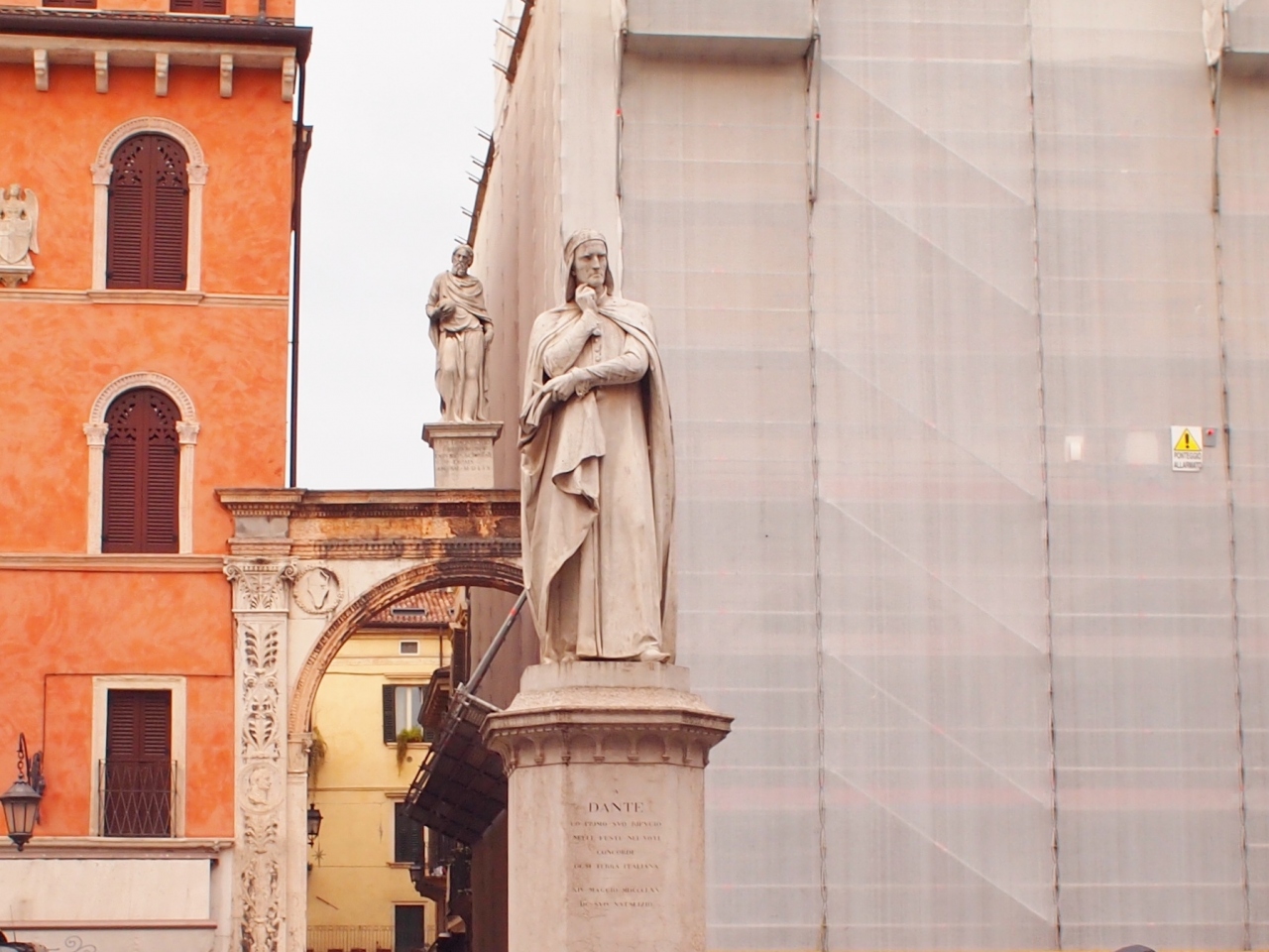 エルベ広場に隣接していますが、露店が並ぶエルベ広場に対し、ここは重厚な建築物に囲まれ、露店もなく、とても落ち着いた雰囲気です。広場の中央にはここで亡命生活を送ったダンテの像が立ち、スカラ家の宮殿や市庁舎、議会が置かれたコンシリオの回廊など、政治を担ってきた建物が重厚な雰囲気を醸し出します。
