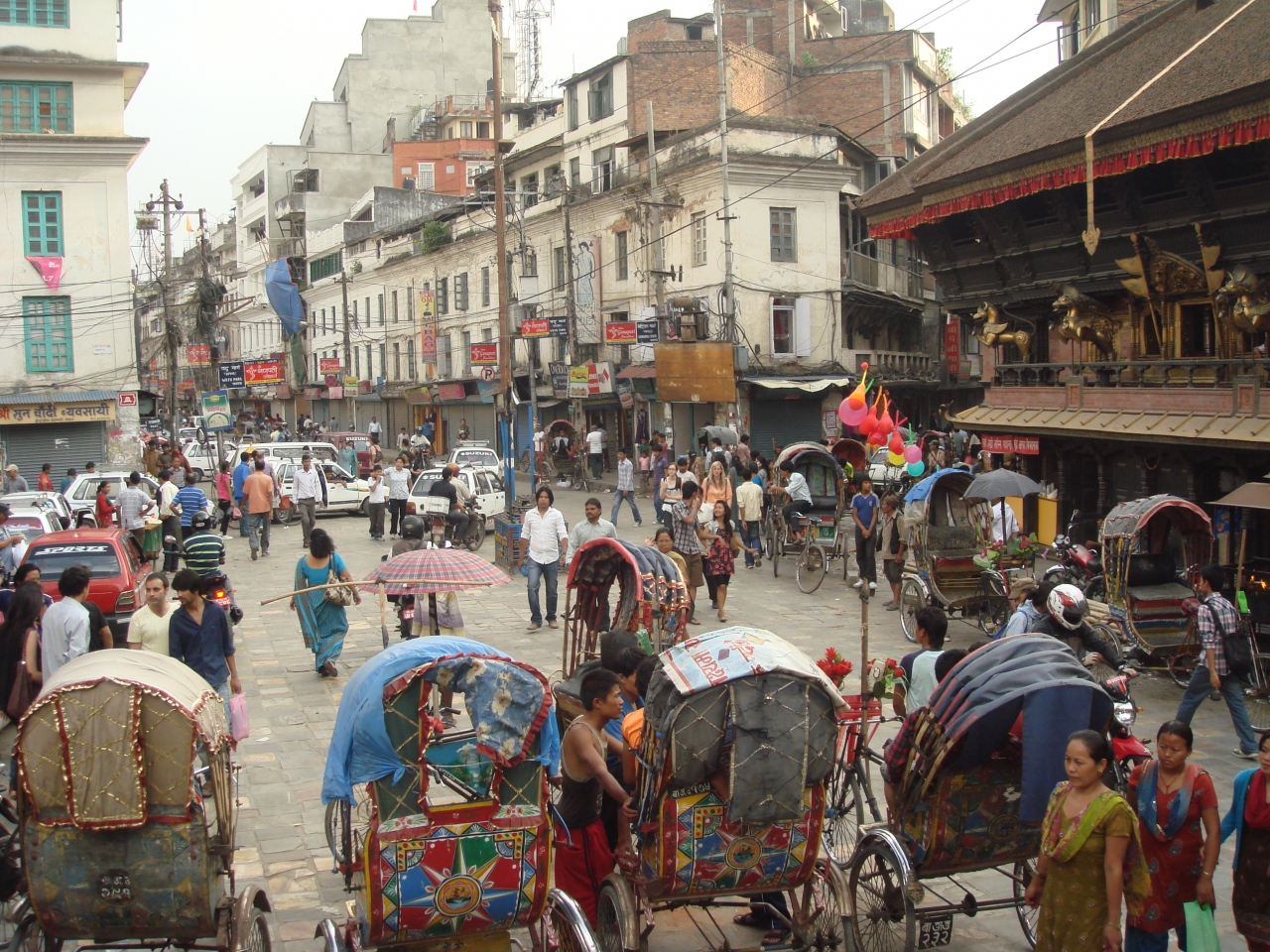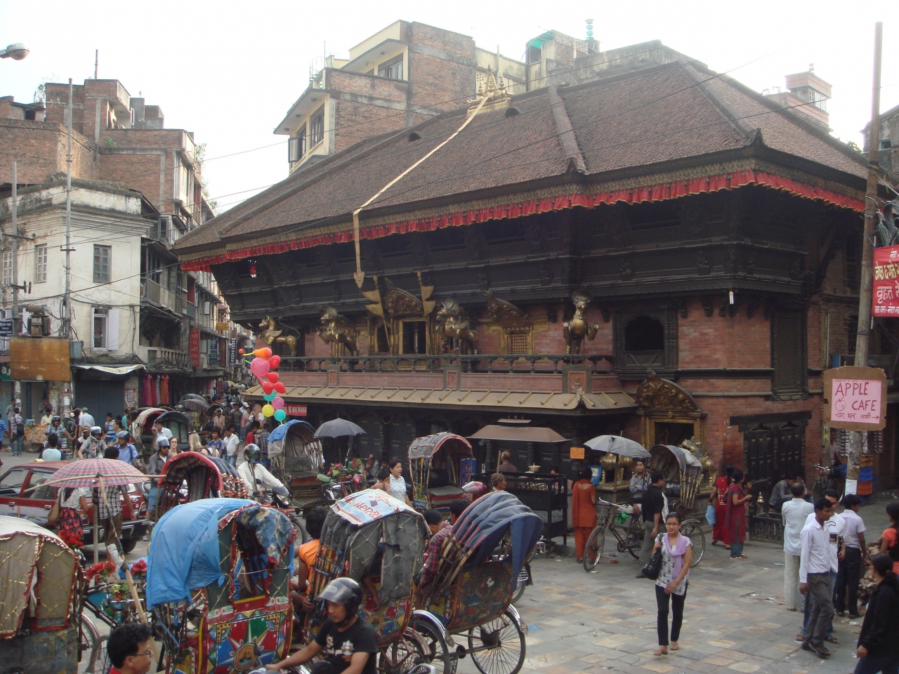 とにかく人の往来が激しい、賑やかな広場。アカシュ・バイラヴ寺院、シヴァ寺院、マハデーヴ寺院もあり、買い物客やダルバール広場に向かう人々で混雑している。カトマンズの喧噪を写真に収めるのにいい所。