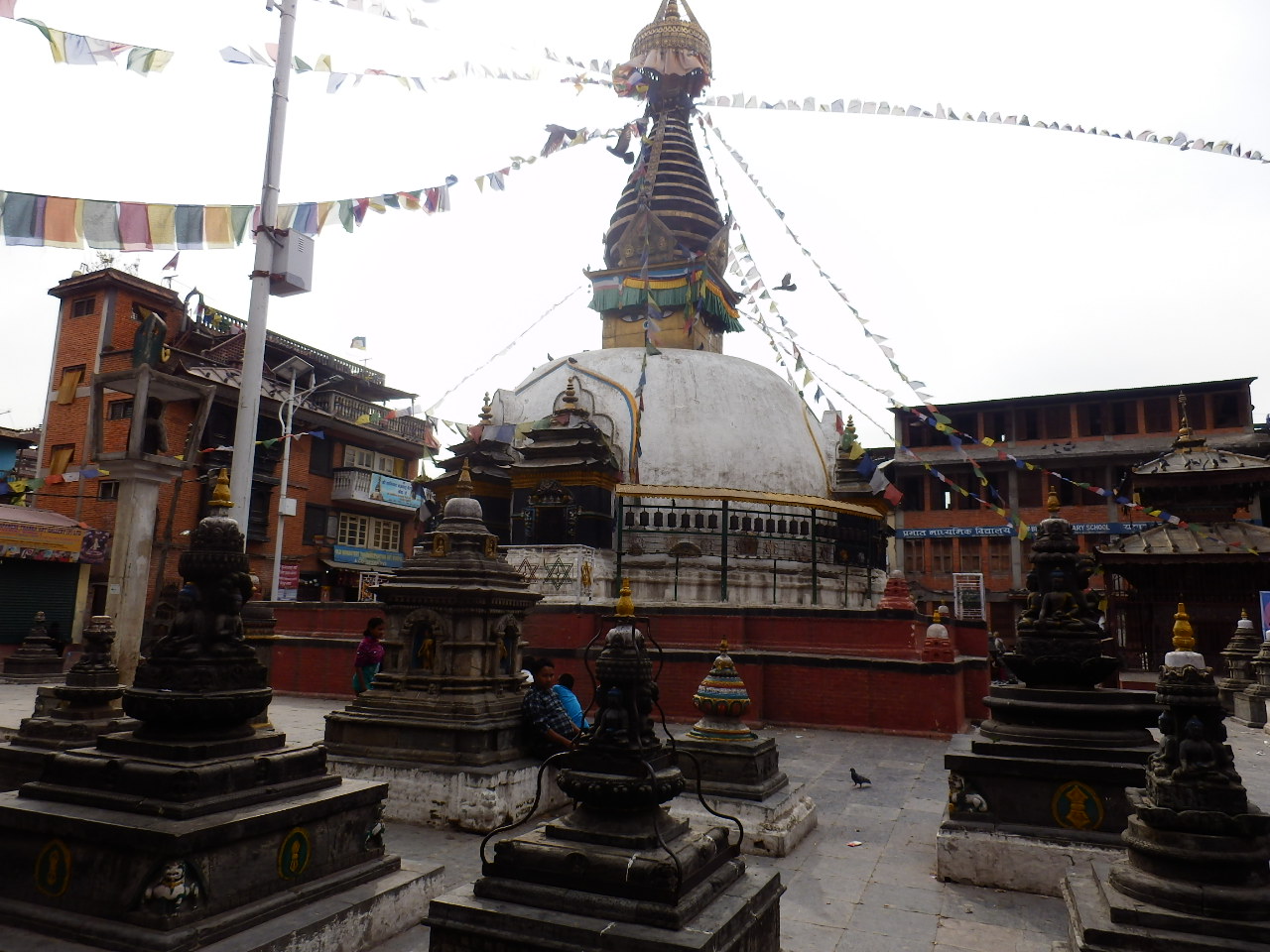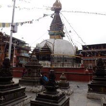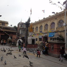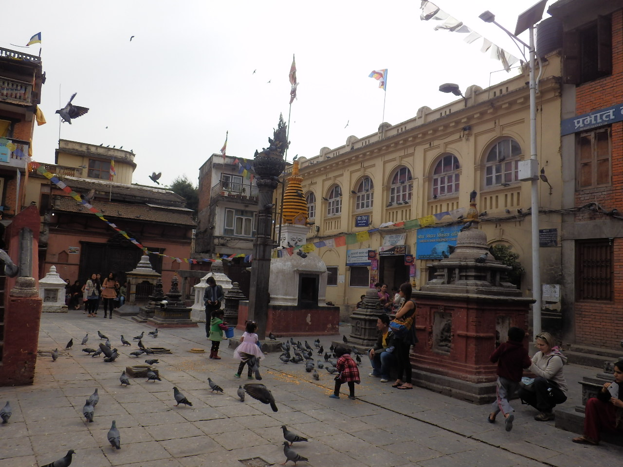 タメルチョークから南へ歩いて数分、中央に白い仏塔がある広場がこちらのタヒティチョークです。白い仏塔の周りにも小さな仏塔がいくつか並んでいて、子供達がハトと戯れて遊んでいました。広場の周りには両替所や商店などがありましたが、一角に仏教らしきお寺も1つあり、覗いたら可愛い子供達がお寺の中を案内してくれました。