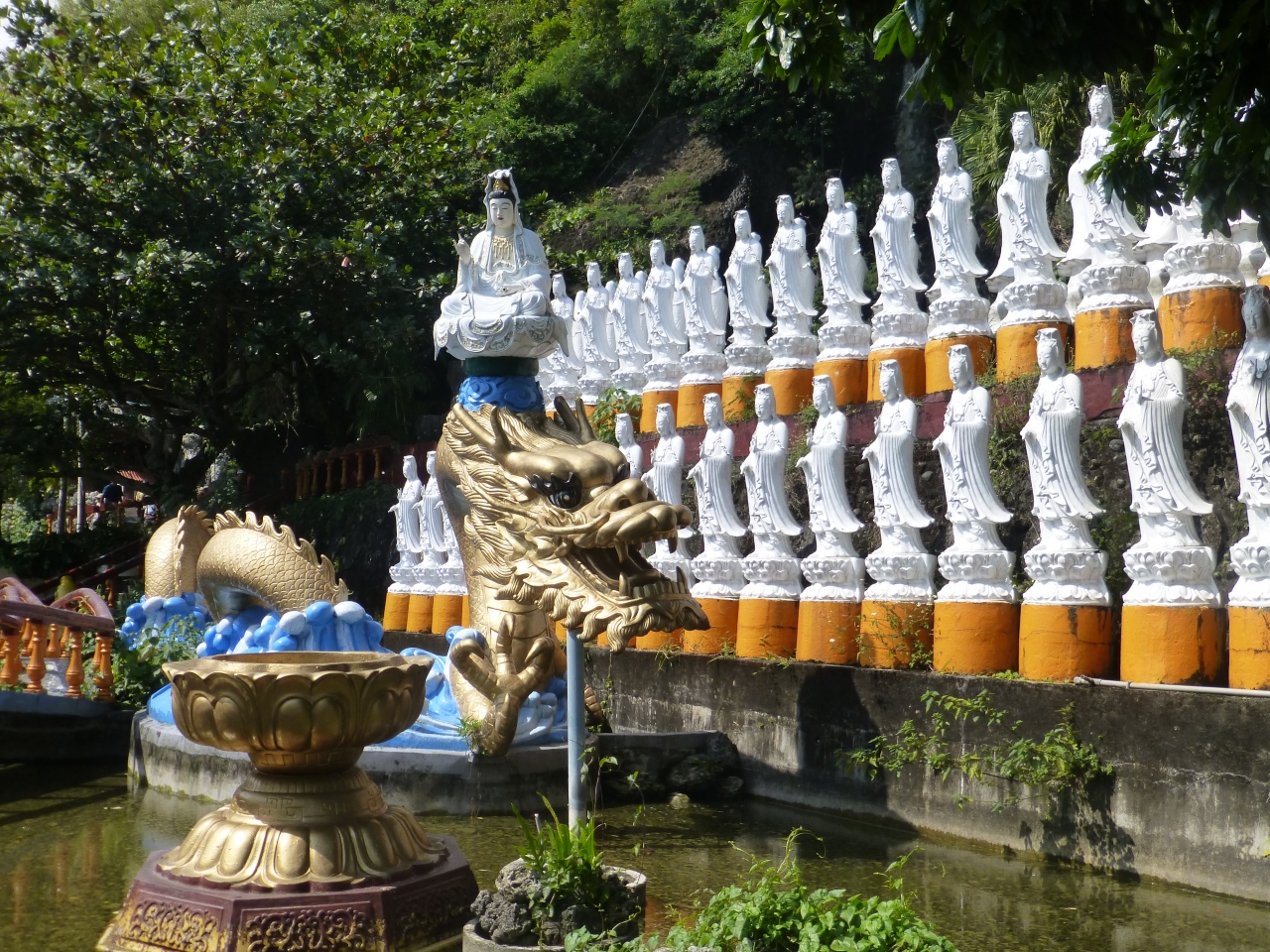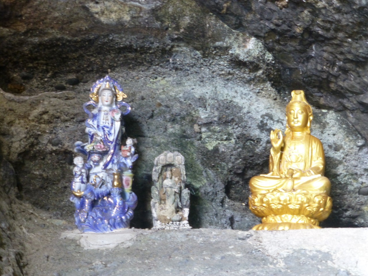 `台湾温泉ツアー5日間`で台東(三仙台/`八仙洞`)から花蓮に着きます。岩山の洞穴で、仏像が…洞ではお釈迦様/観音様/水も頂きました、外の岩では百体仏像。日本でも洞穴の仏像がありますネ(中には岩に直接掘ったのも)。