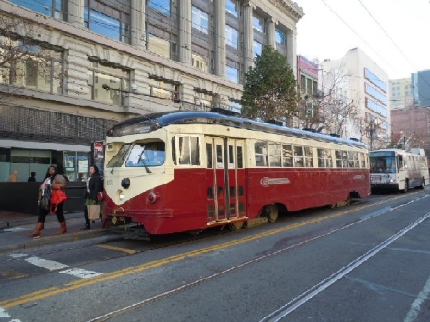 世界中から集めたアンティークの電車がサンフランシスコの街の中を走り行く(郊外では地下をはしっています!