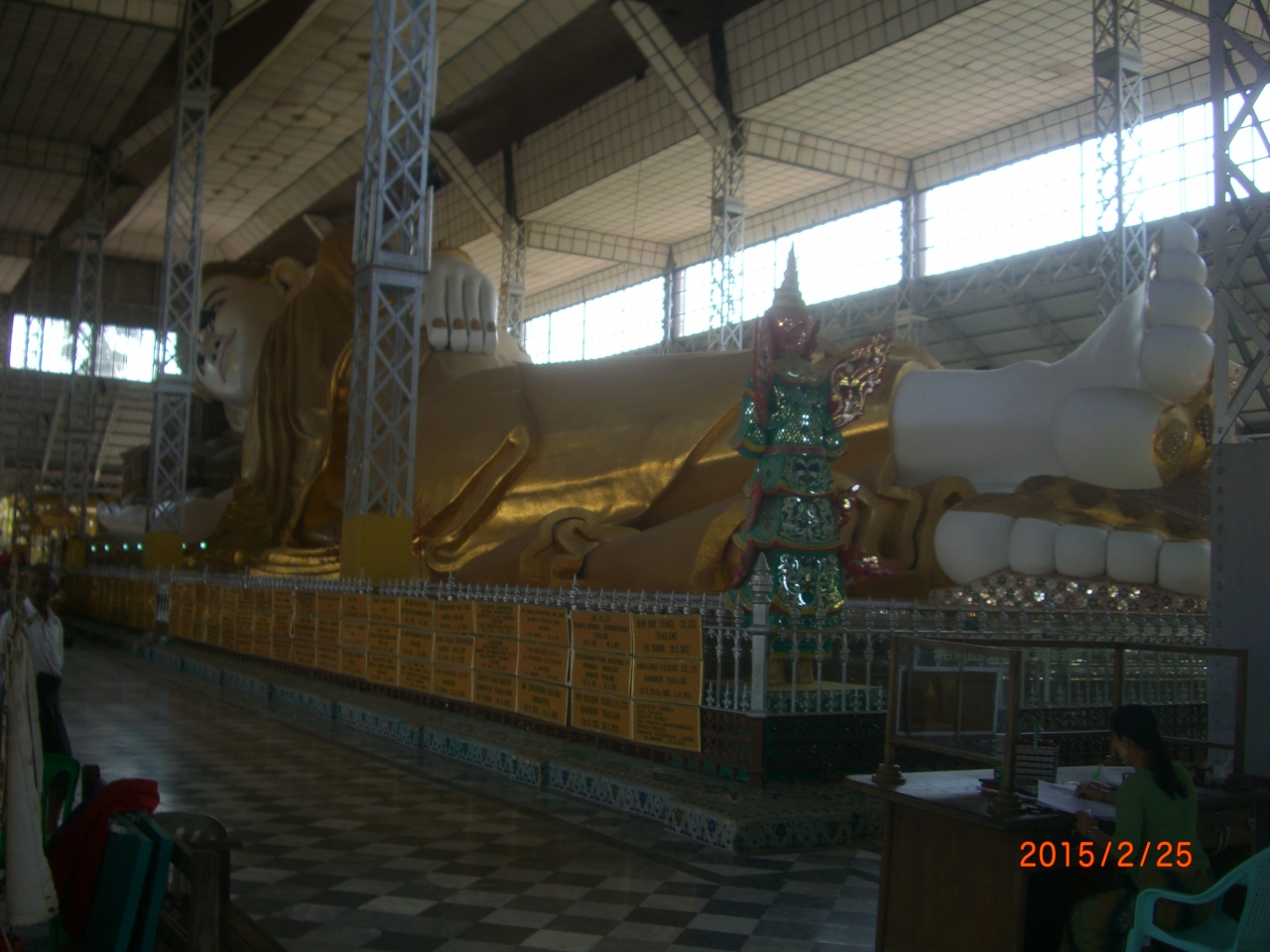 パゴーの象徴の寝仏、兎に角デカイ。背面にはドレスデンの君主の行列の様な物語の絵(浮彫彫刻)が描かれている。パゴー入域料 10000Kに加えカメラ撮影料300Kが必要。日程に余裕がなければ早朝にヤンゴンをチャーター車で出発すればチャイティーヨー観光の後バゴー観光の日帰り観光が可能。