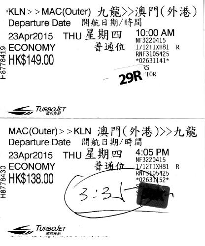九龍からマカオへ向かうフェリーターミナルは、九龍半島尖沙咀の広東道の北の端にある『中港城』です。巨大なショッピングモール『ハーバーシティ』の北側に当たります。マカオへ向かう出発フロアはこの2階(香港で言うと1階)に位置していて、フェリーのチケット売り場も、同じフロアにあります。前日に中港城に来てチケットを買って置きました。3社あり九龍ー澳門のキップ売り場は一番奥でした。