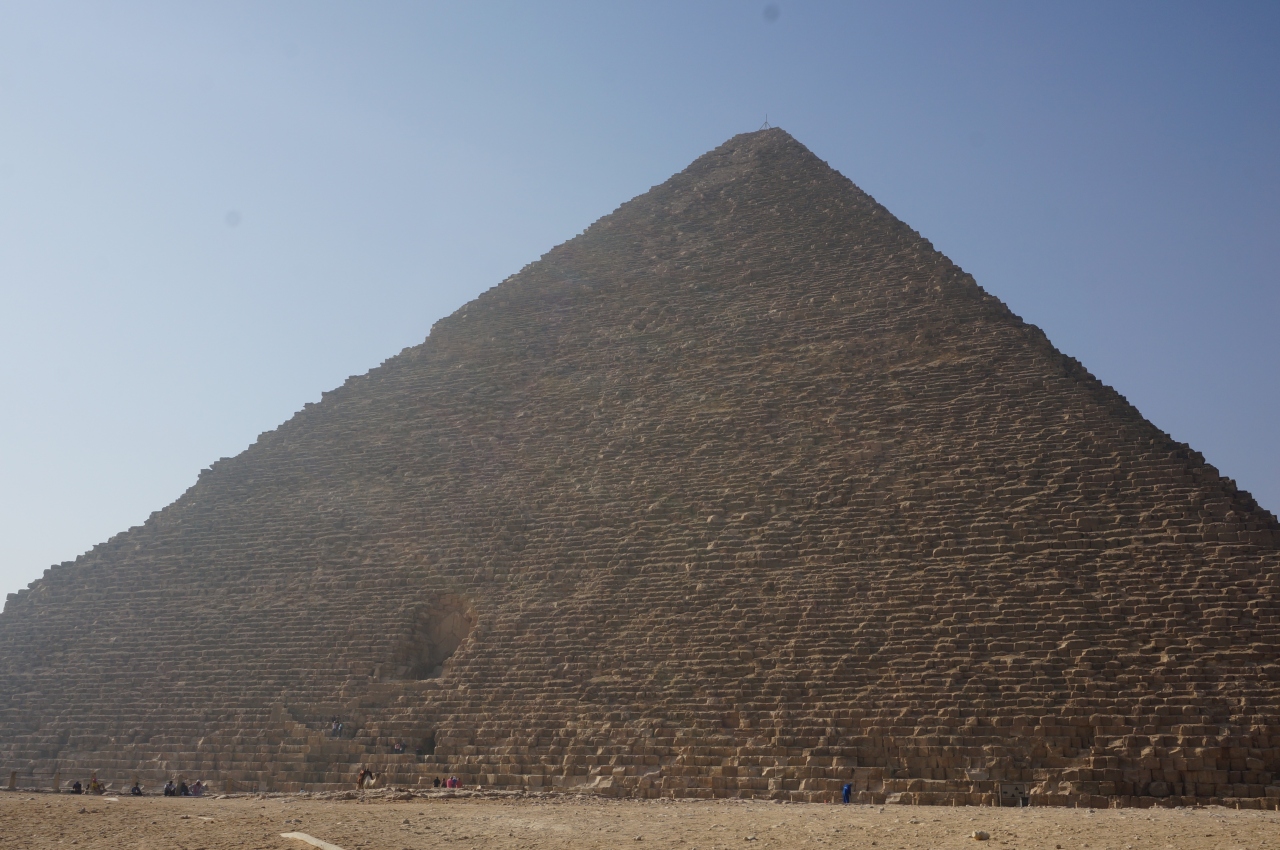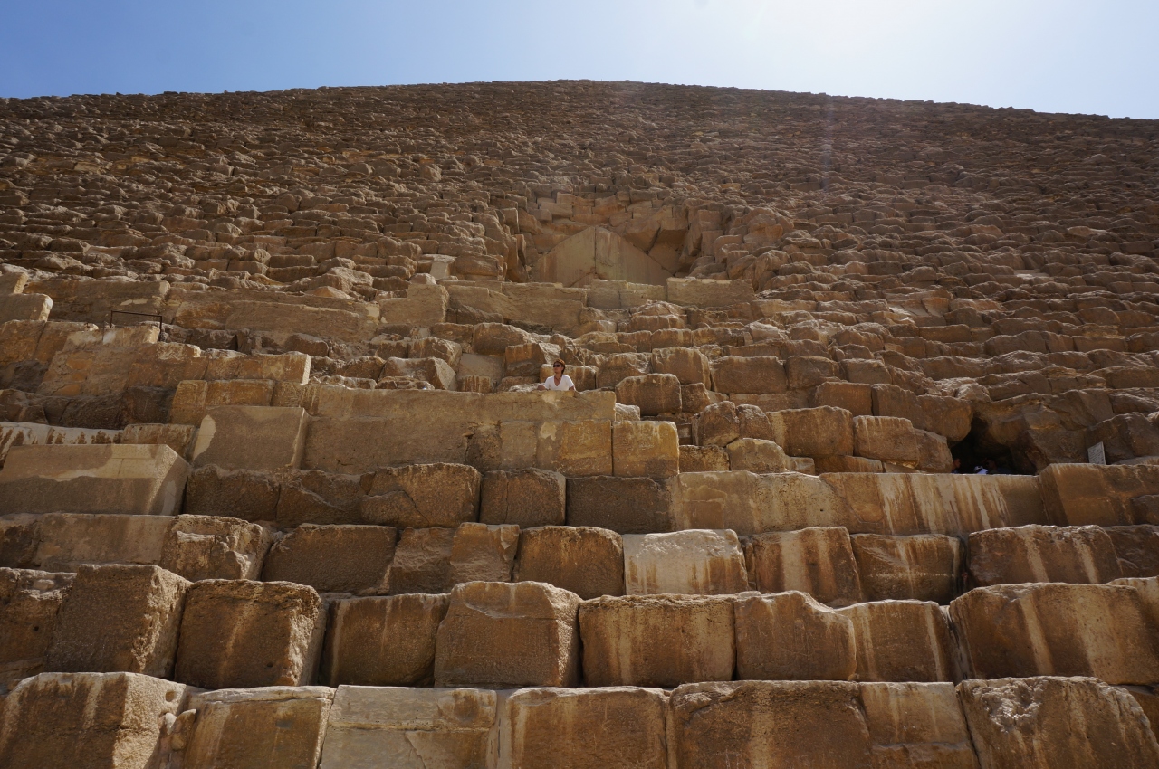 朝一にカイロ中心地から路線バス(2E£)で近くまで向かい、残りは徒歩で到着。入場チケット(80E£)は買えたが、クフ王ピラミッド内部に入るチケット(午前150人限定)は既に完売だったため、午後の部(150人限定)を受付時間になり次第Get(200E£)!クフ王ピラミッド入口で陽気なおじさんスタッフに持ち込み不可なカメラを預け、内部は少し進むと低姿勢で階段を上ったりと王の間に着く頃には汗ダクダクでした・・・それにしても外観は1段1段の岩が大きく、迫力が凄まじいです!ただ、敷地内には写真に故意的に紛れ込んだり、いきなりガイドを始めてお金を要求してきたりする人がウロウロしているので要注意!!小さい頃から行きたかった場所に行けたので大満足でした!