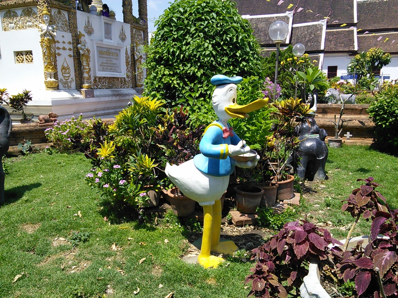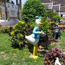 それと面白いものもあります。このお堂の前の植え込みの中に仏像や動物の置物に混じって何やらどこかで見かけたことのあるような物体が…。世界的に有名なアヒルのキャラクターに似ている気もしますが…。いやいやこんな所にそんなものが…。おそらく気のせいだと思います。みなさんもご自身で確かめて下さい。