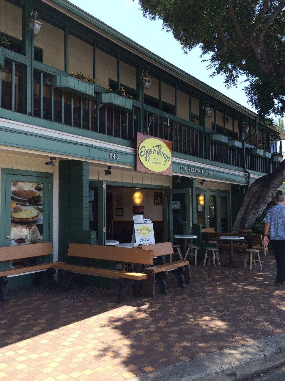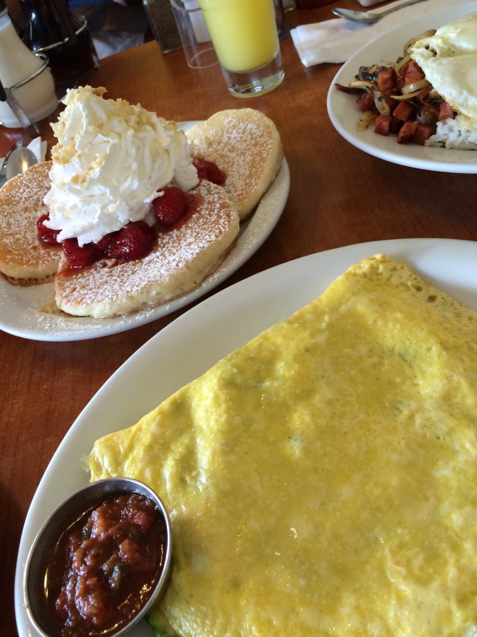 日本でも人気のパンケーキやさん、エッグスンシングス本店!混雑が予想されたので、早目のランチへと11時頃行くと、5分程の待ち時間でカフェエリアに案内された。まず、1階の受付で名前と人数を言うと、準備ができたらよびだされるアラームのついた機器を渡される。そこに書いてある日本語が、よくわからない日本語訳だった・・・ので意味がわからなかったが、アラームがなったら、2階のカフェエリアに行けばいいということだった。カフェエリアへの階段も中もあまり広くないので、1階で順番を待つという趣旨だったよう。オムレツとパンケーキを注文。お腹が減ってないなら、量が多くて食べきれないから、どちらかにしたほうがいいよ!とウェイターさんは親切に教えてくれた。両方たべたかったので、サイドメニューのパンケーキ(半分の量)にイチゴとホイップのトッピングに変更してもらった。こういう交渉にはやはり、英語は必須だと思った。
