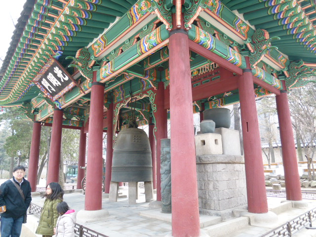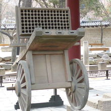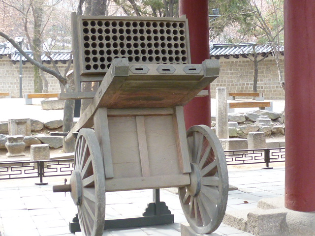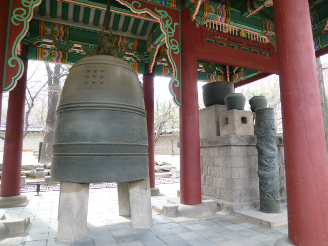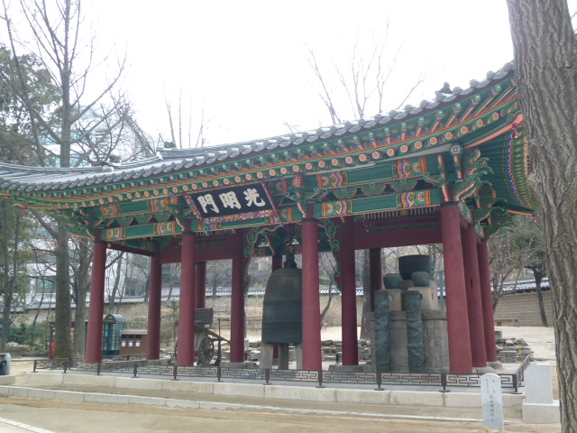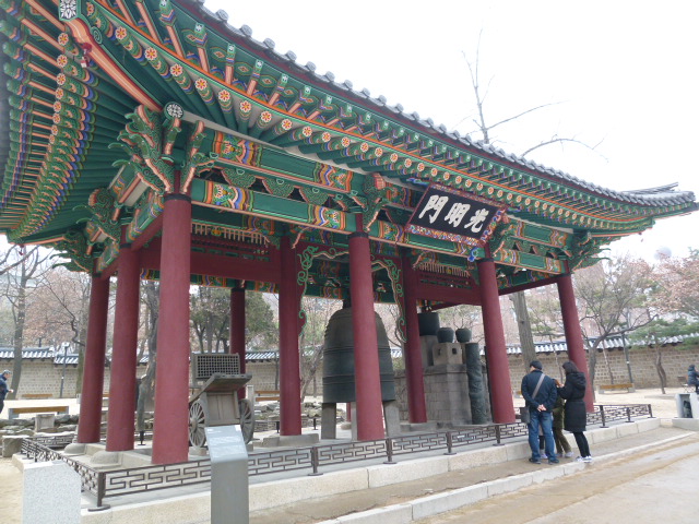 徳寿宮の正門(大漢門)をくぐり道なりに進むと右側に中和門があります。その先の左側にあるのが光明門(クァンミョンムン)があります。門構えは韓国伝統的造りで、色彩がとても美しい建物です。門に展示してあるものはなかなか興味深いものばかりでした。移動式の発射装置を備えたこの火車(神機箭機火車)や李朝時代に活躍した自動水時計(自撃漏)や日本でいう梵鐘(ぼんしょう)の銅鐘が並んでいて自由に鑑賞できます。