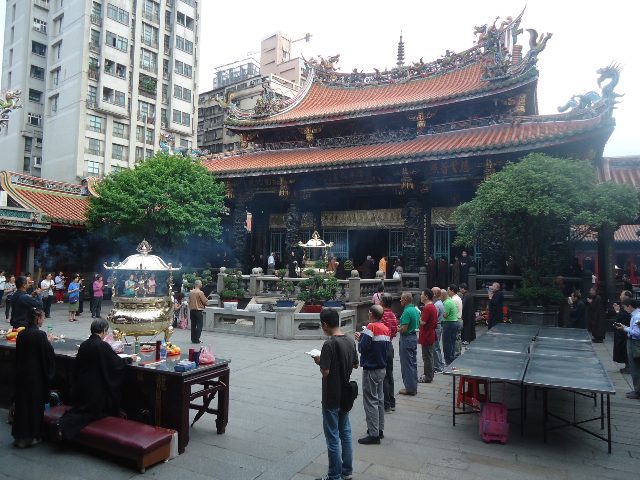 朝の6時半くらいに龍山寺にお参りに行きました。早朝から熱心な信者たちが、一生懸命お経を唱えながら、お祈りをしていました。たくさんの人が境内にいっぱいで、日本ではお正月やお祭り以外であまり見ない光景でした。