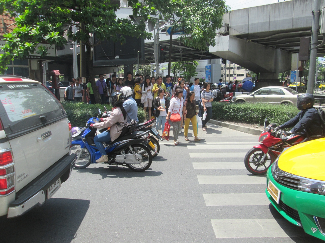 朝早くから夜遅くまで車の通りが激しい通りです。歩道を歩く人の量も多く、日中は警察による交通整理が行われていました。特に、パヤタイ駅周辺の通りにはオフィスがたくさんあり、ランチで屋台に向かう人で通りがごった返します。