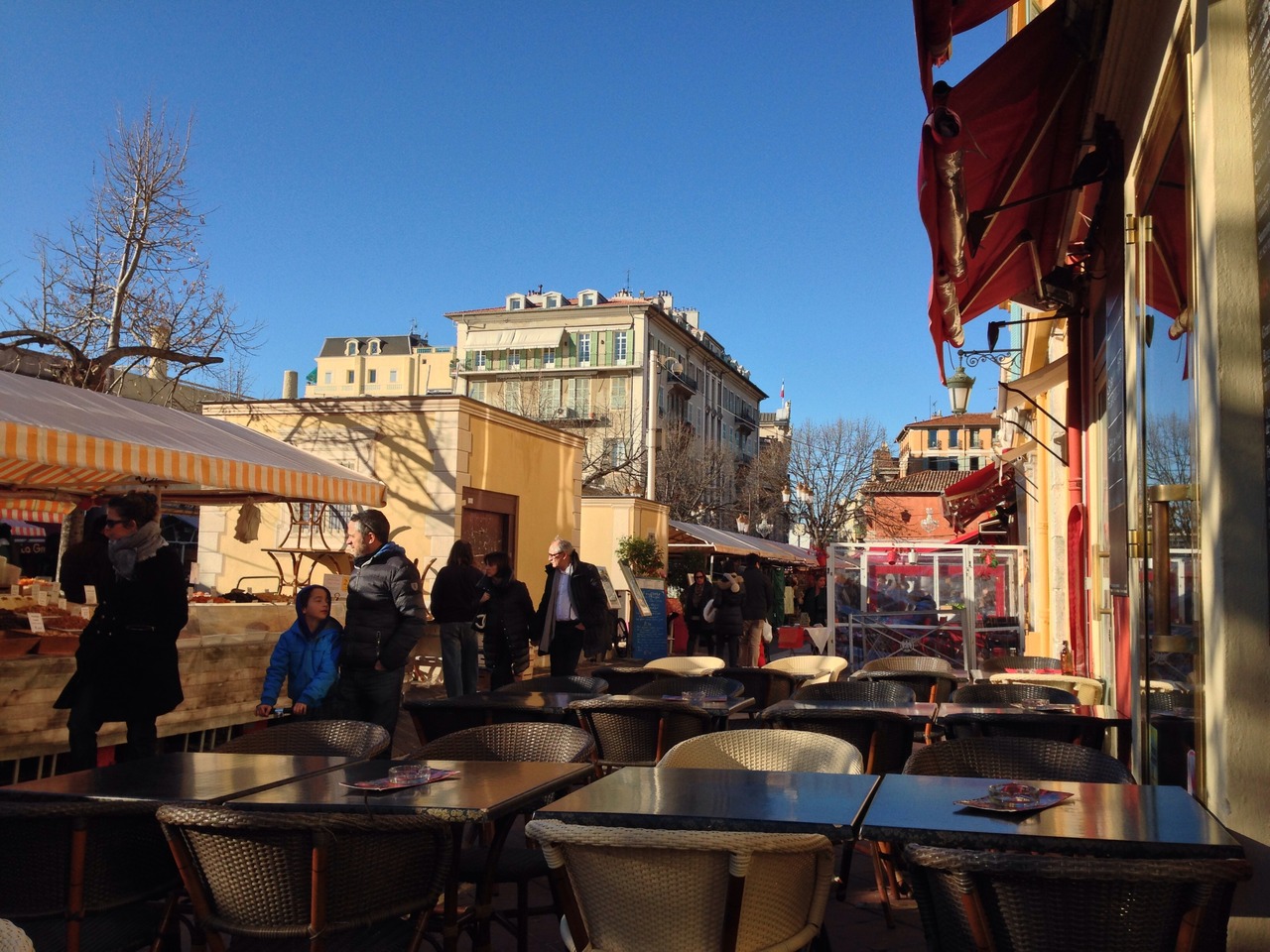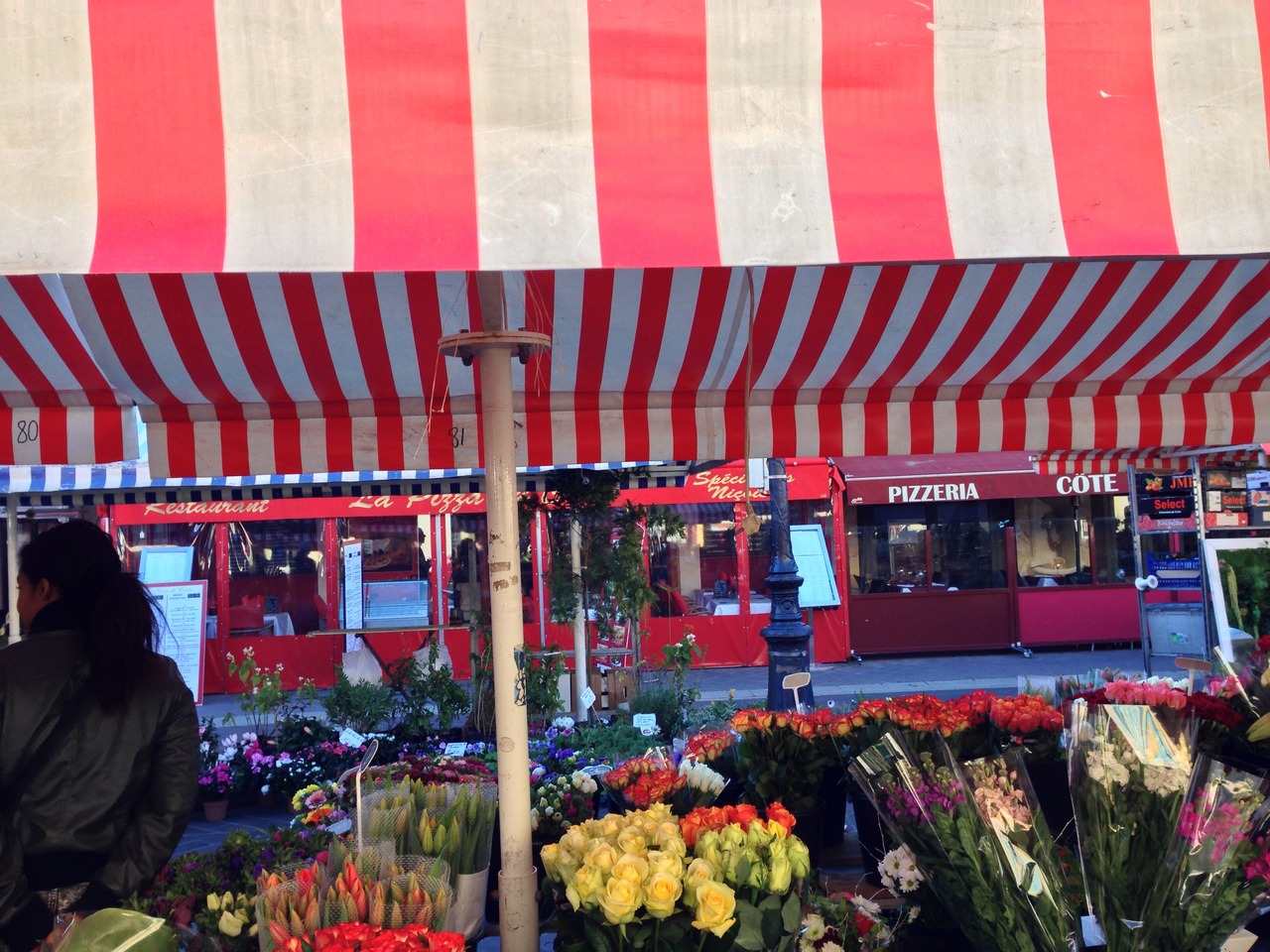 お花をうるお店が多く、見た目にも美しいマルシェ。プロバンスの雑貨なども売っている。両側はカフェが並ぶので朝ごはんを食べたり、お茶しながら