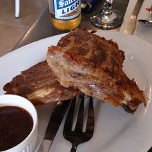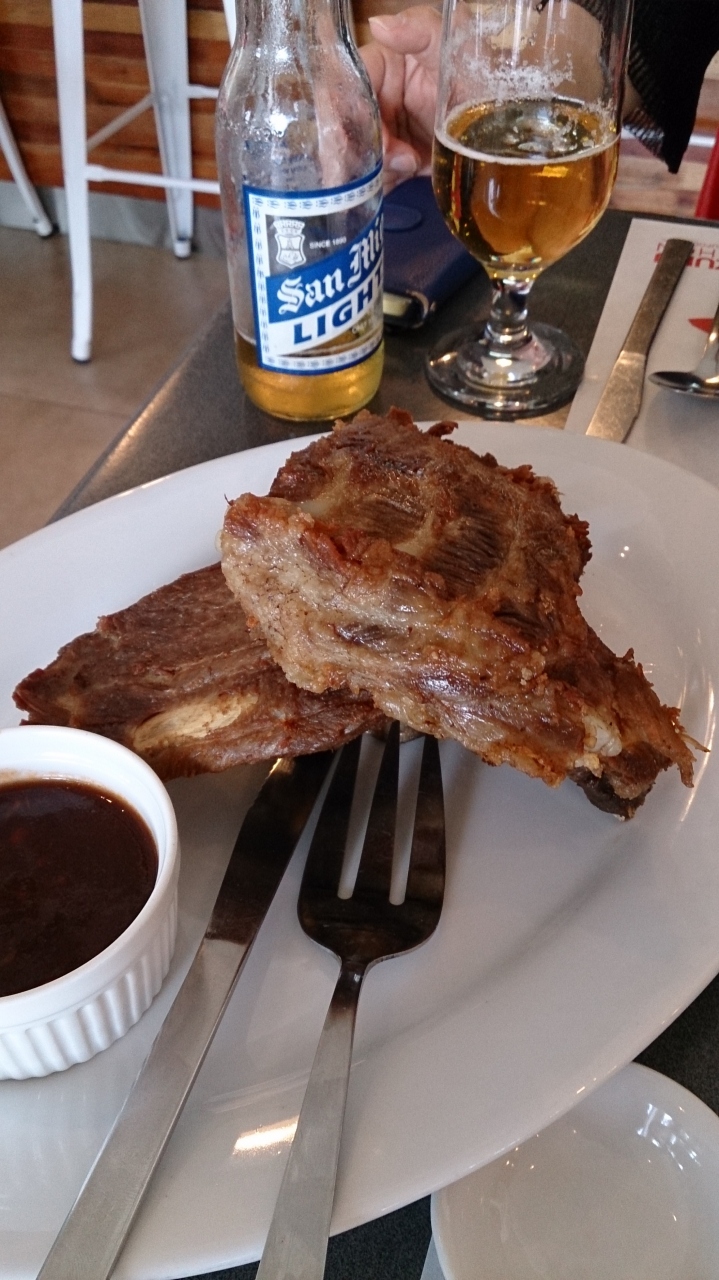 骨付きの豚肉は、表面がパリッとして、お醤油とかんきつ類、生の唐辛子などを好みで混ぜて作るソースがさっぱりスパイシーでとっても美味しかった!