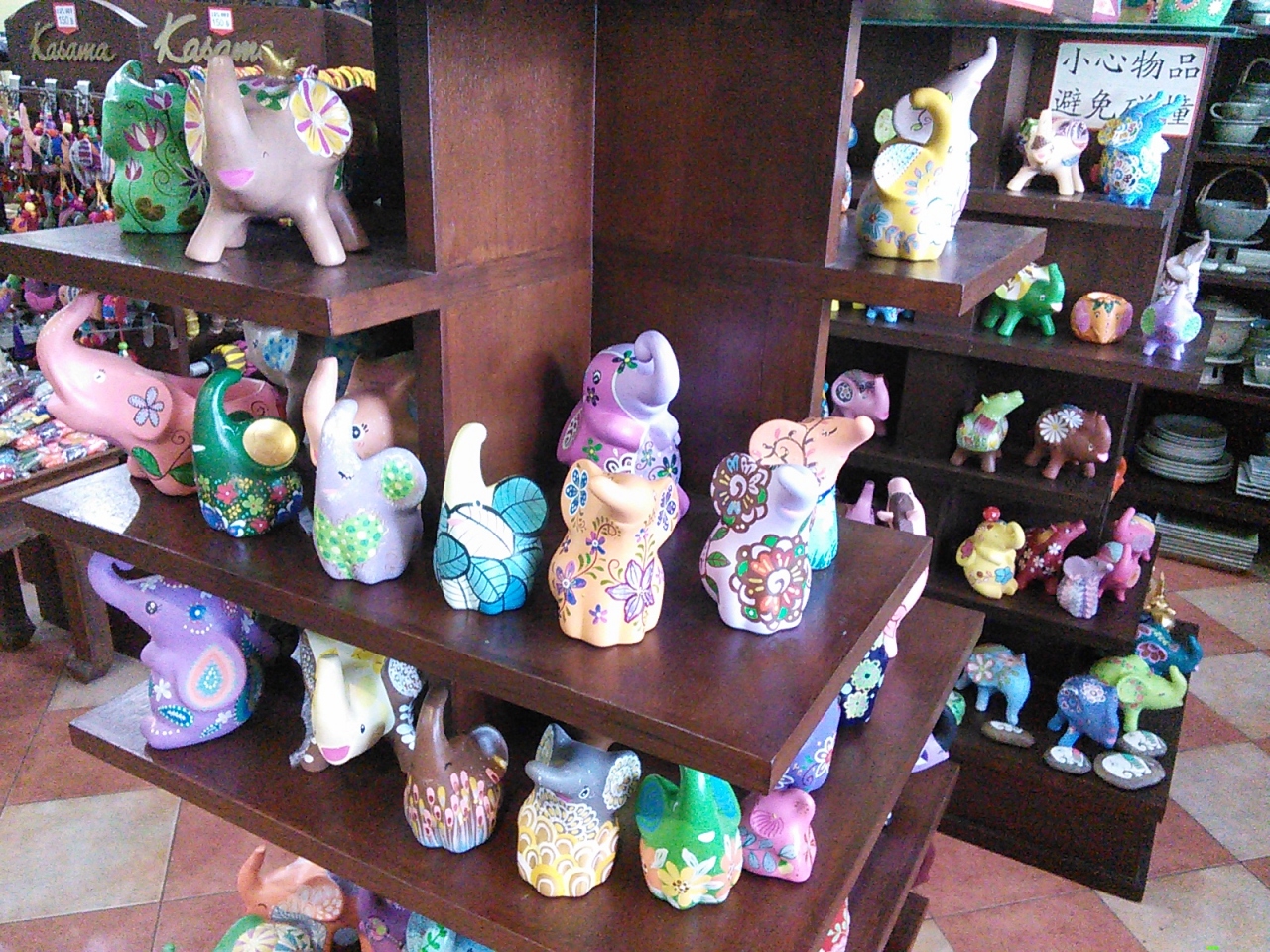 店内は少し高級なもの。ゾウのかわいらしい人形(600B~)やポットとカップのティーセットなど。他にはお香(60B~)やお香立て(100B~)、変わったところではブラスチックのポンプが付いたシャンプーボトルなどもありました。