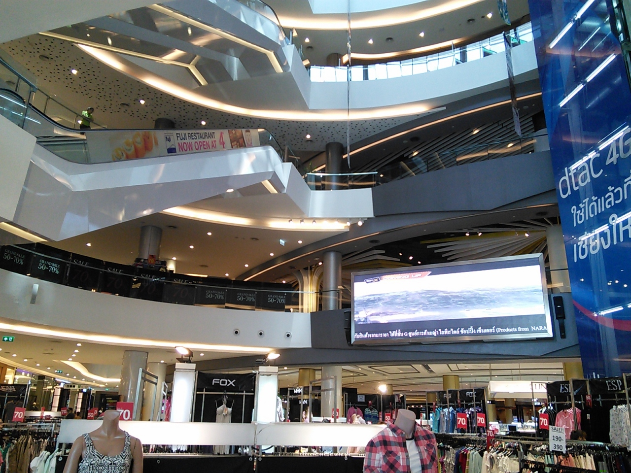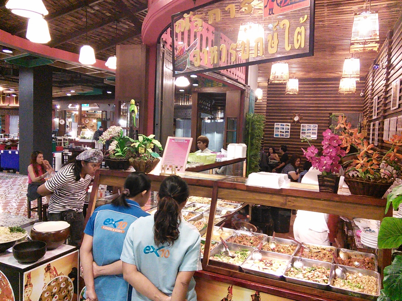 特に4Fにある「Food Lanna」というフードコート。いや、今までのフードコートというイメージとは一致しません。テーブルをずらりと並べずに空間を上手く利用した斬新なスタイルです。あるカオラートゲーン(下品な言い方をすればぶっかけ飯)屋でカオヤム(Rice Salad)45Bを食べましたが、これはイマイチ。もしここを利用するなら他の物にした方がいいです。地下にも手軽に食べられる屋台街があります。日本食材が買えるリンピン・スーパーマーケットも入っています。5Fには最新設備のシネコン。6Fにはオープンテラスのバーやレストラン(16:00~2:00)もあります。