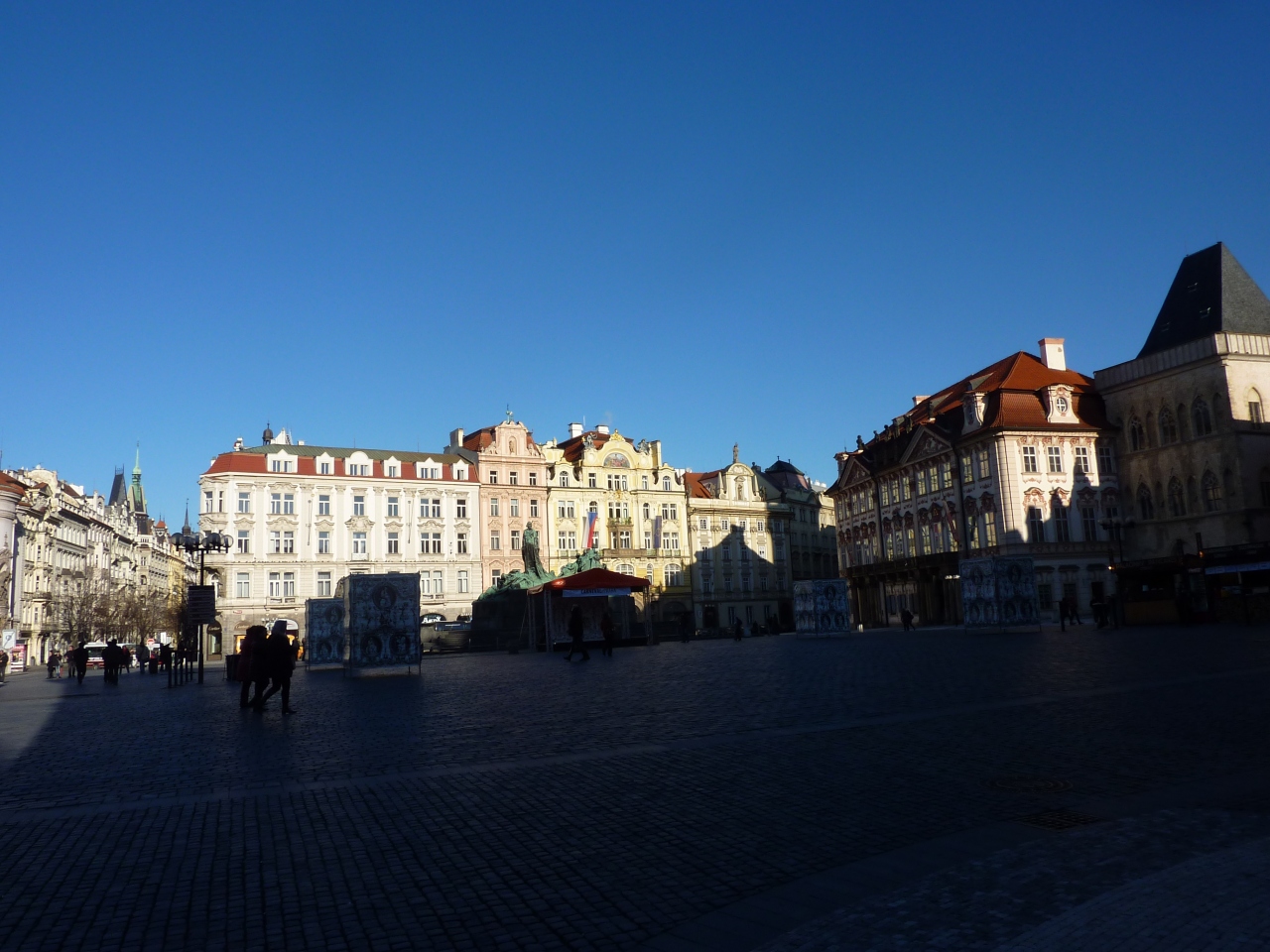 市内最大の旧市街中心部で旧市庁舎、聖ミラクーシュ教会、ティーン教会、ゴルツキンスキー宮殿などの囲まれ、ヤンフス像が広場中央に位置し、周辺にはレストランや土産物店が店を広げています。