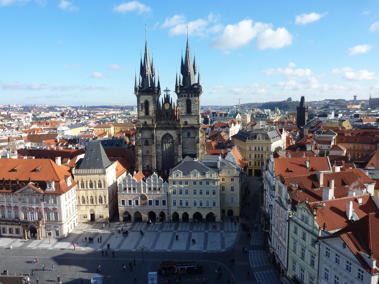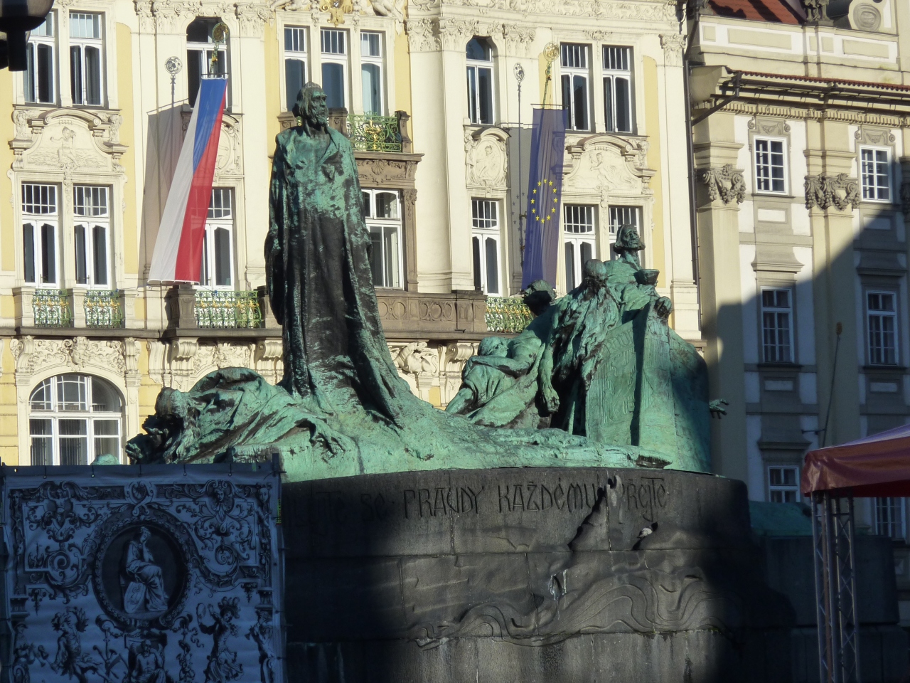 ヤンフス像を中央に配し、旧市庁舎や教会に囲まれた商業の中心地としてチェコの歴史に関わってきた広場