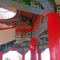 またこの建物ですが外見は赤褐色の屋根と朱色の柱ですが、建物内部の梁の部分の塗装が、ど派手な中国伝統模様でこちらは色鮮やかさで美しく、見ごたえがあります。