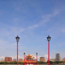 湖の際の春秋閣からまっすぐ100mぐらい伸びた橋の先、湖の中央に建っている二層の建物で壁もなく、湖上で周囲に全く遮るものがないので、流れる風が本当に気持ちいい。亜熱帯の高雄の気候で本当は暑いはずですが、湖の水で多少は風の温度が下がっているのかと思わせます。思わず昼寝をしたくなります。周囲360度何もないのと遠目に龍虎塔、春秋閣、玄天上帝、外周道路の車、さらには高雄の街のマンションやビル群が見えますが、思いのほか静かで時計のスピードが遅い感じに錯覚します。