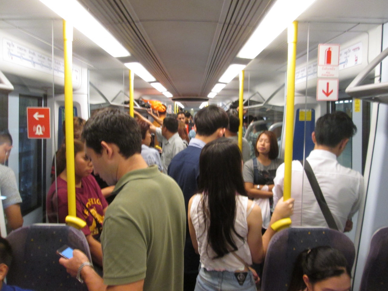 日曜日の18時頃にエアポートリンクを利用すると空いていました。平日は駅員が駅ホームで整理し、途中駅では乗車できないするぐらい混雑していますが、車内も座席には座れませんでしたが、立っていて乗車しても不快に感じませんでした。