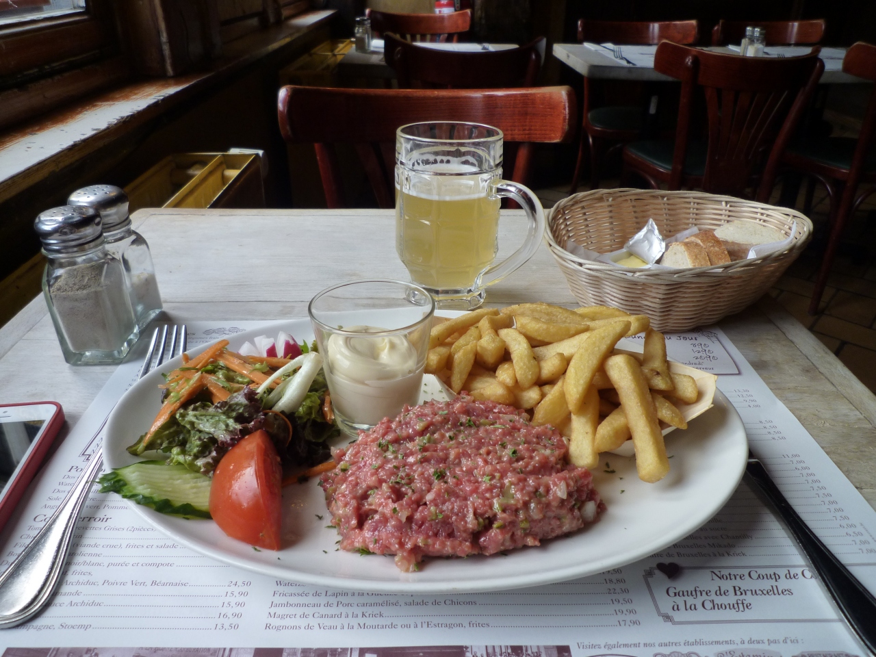 オーダーしたのはベルギーの郷土料理、フィレアメリカン。いわゆるタルタルステーキです。大きめのハンバーグ大と、量はかなり多め。でも玉ねぎやピクルスなどが混ざり合っているようで、すごく美味しかった!付け合わせのフリッツもほくほくで美味しい。