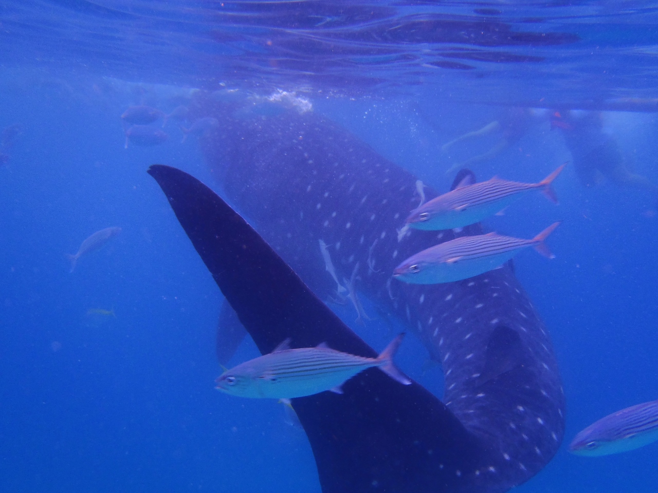 自然のアクティビティには確実という言葉が難しいところ、このジンベエザメはほぼ100パーセントの確立で出会えます。しかも、1匹ではなく何匹も。野生のジンベエと確実に一緒に泳ぐことがでできるのは、世界でここだけのようです。