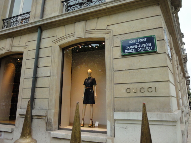パリのグッチです。シャンゼリゼ通りとモンテーニュ大通りが、ちょうど交わったようなところにあり、高級感も観光客の賑わいもかんじられる、いい場所にあるお店です。やはりかちっとした現代的な機能的かつモダンなイメージでしょうか。