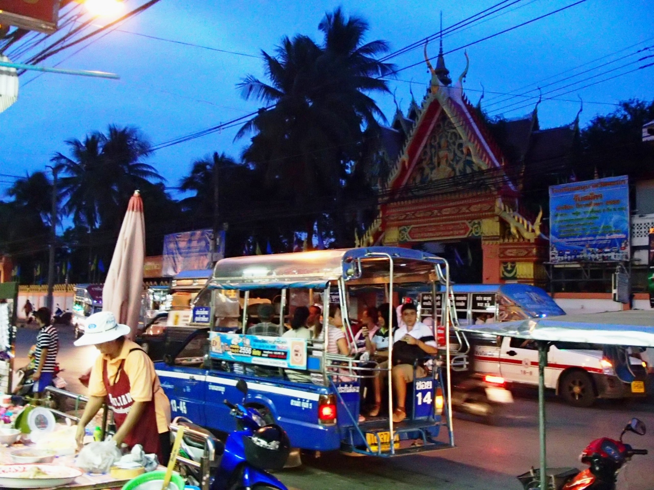 第1バスターミナル前のBurin Rdを北に抜けて、大通り(Mittraphap Rd)に出たすぐ左に、15番バス他が停車する。客が待っていれば徐行するので、乗るべき番号のソンテウであれば手を上げるなど合図して乗車する。
