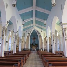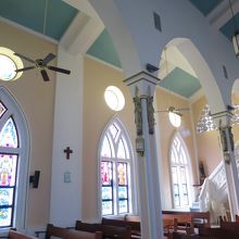 教会の中は白い柱に水色の天井、そしてステンドグラスがとても綺麗です。誰も中に居ませんでしたが、お祈りして見学させて頂きました。