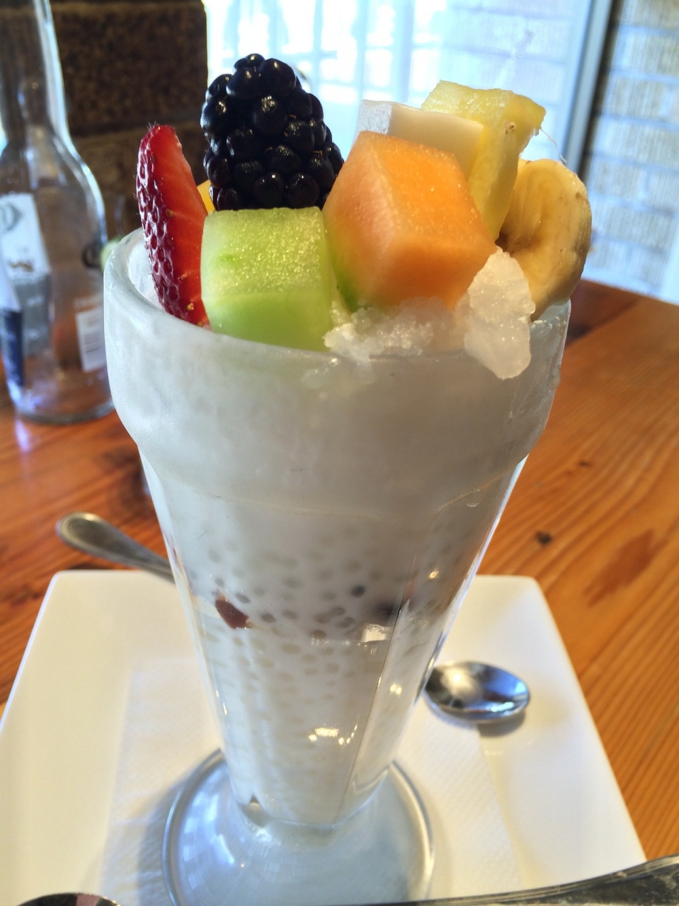 ココナツベースでタピオカが入っていて、上にはかき氷のハロハロとフルーツが。中には小豆が。