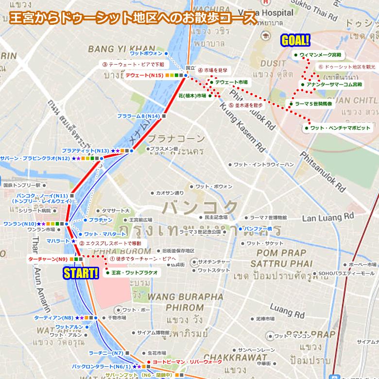 王宮を観光した後、エクスプレスボートでテウェート・ピアまで行って、このような散歩コースを辿れば、ウィマンメーク宮殿をはじめとした観光名所が集中するドゥーシット地区を制覇することも難しくありません。特に気候が爽やかな乾期ならば歩いていても暑さがそれほど気にならないのでおすすめです。