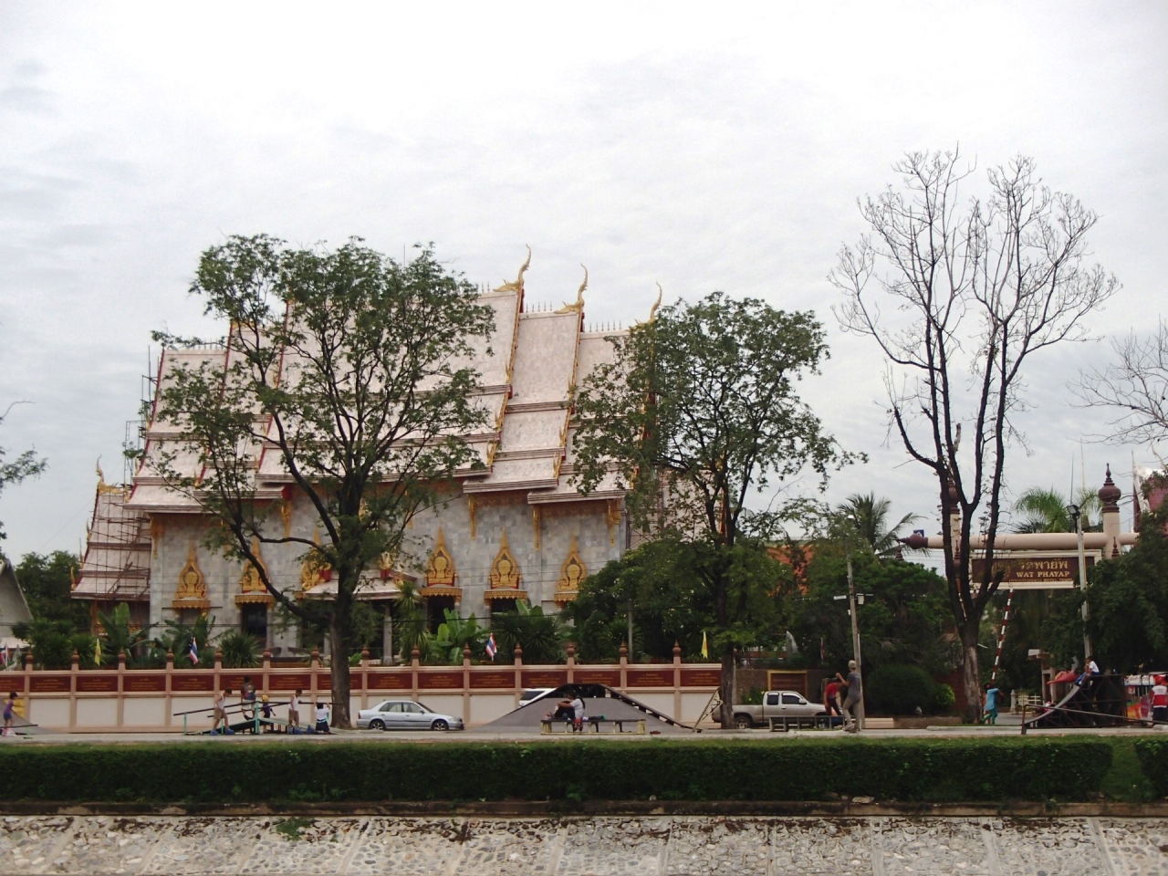 川に架かる橋を渡った先にある、大きな屋根の寺院。ピマーイ、スリンやウボン・ラチャタニーなど、タイ東北部から走ってきたバスが、この寺院の前の停留所で停まる。パノムルン遺跡からの帰り、ドライバーに「ヤーモー」と告げたら、ここで降りろと言ってくれた。