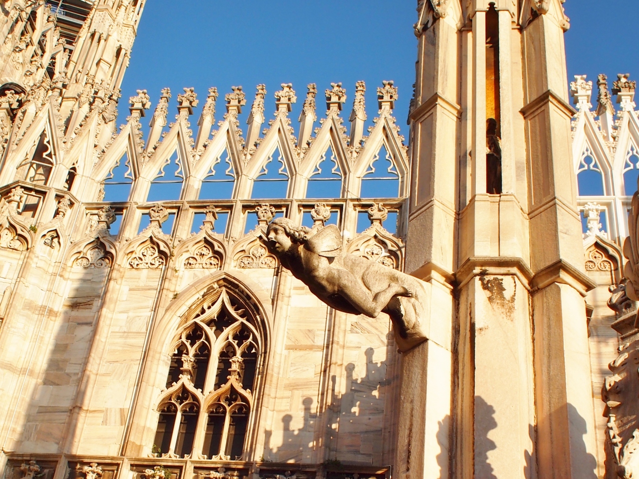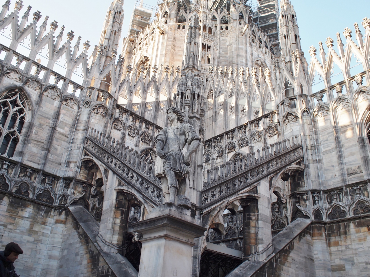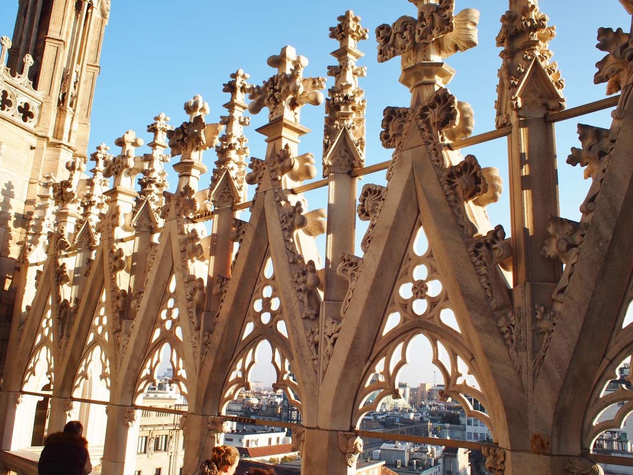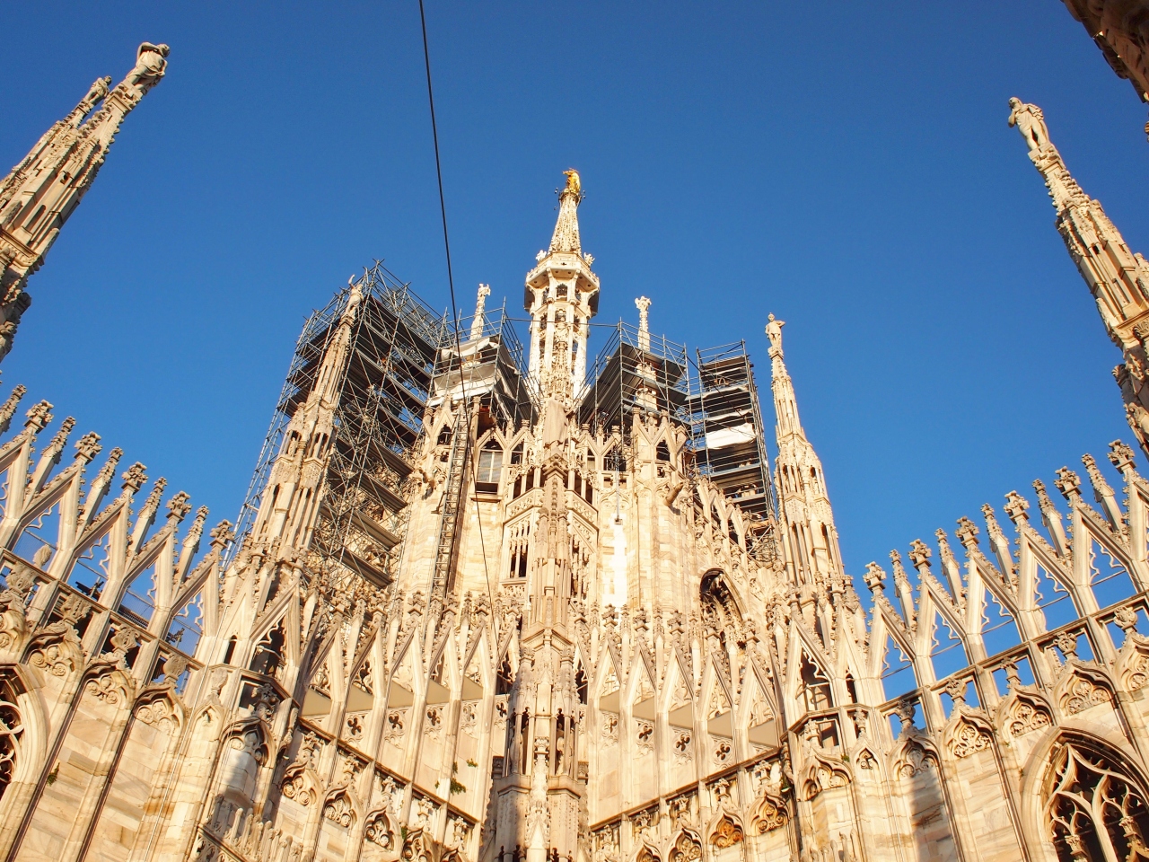 ドゥオーモの内部は写真撮影するのに3ユーロ支払わなければなりません。森を思わせる石の柱が並び立つ内部はとても荘厳な雰囲気ですが、エレベーターで上った屋上テラスも、尖塔が並び立ち、ここも森のように思われました。屋上テラスでは写真は取り放題ですが。ドゥオーモでもエレベーターでも、鞄の中身はしっかりチェックされました。