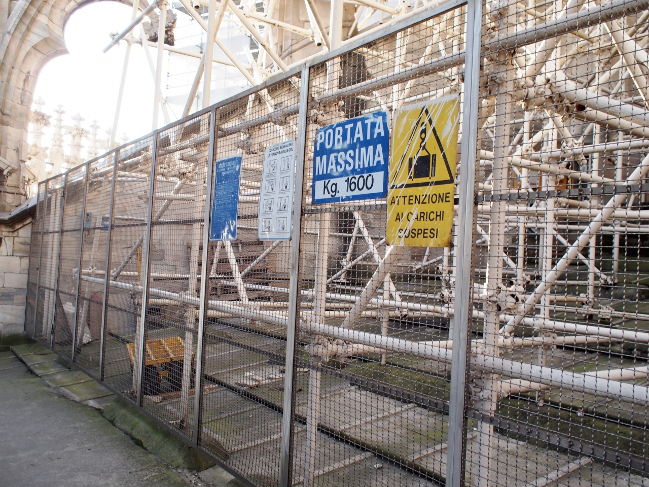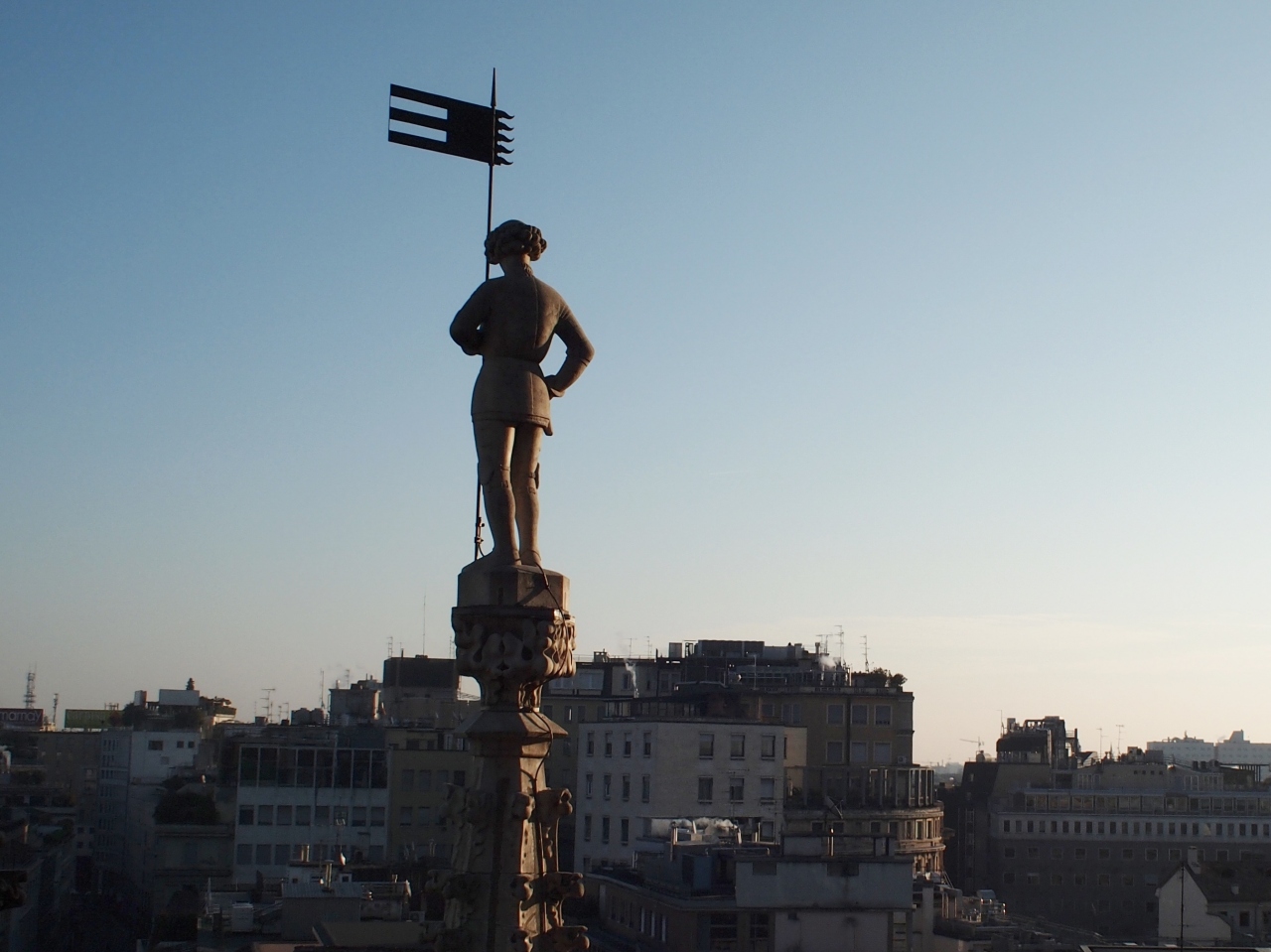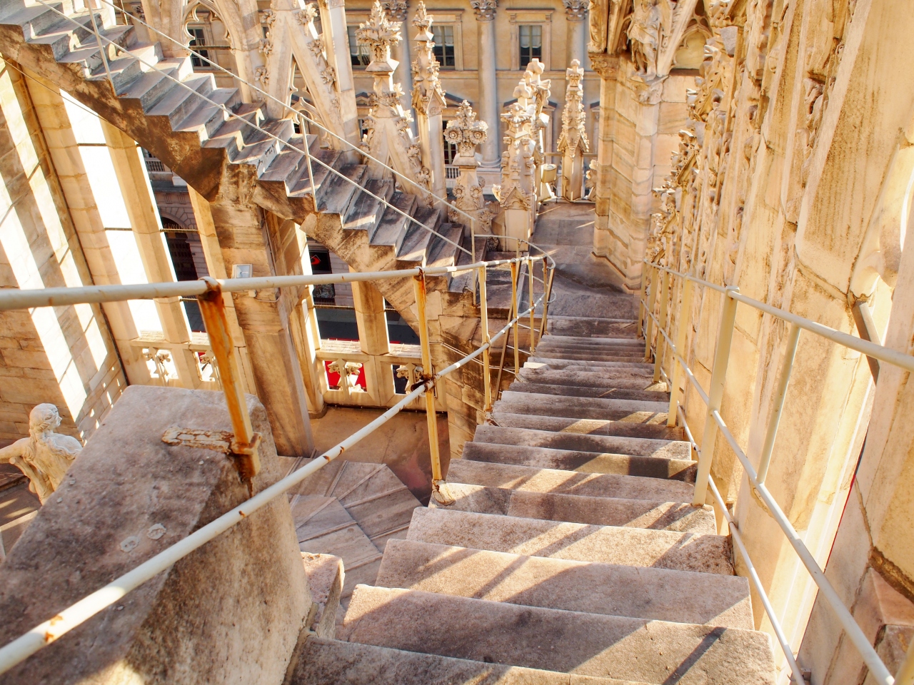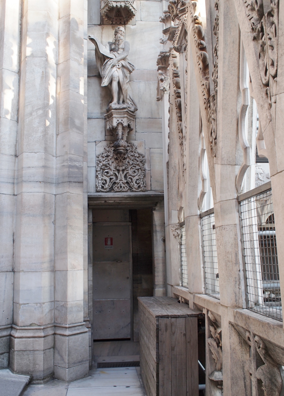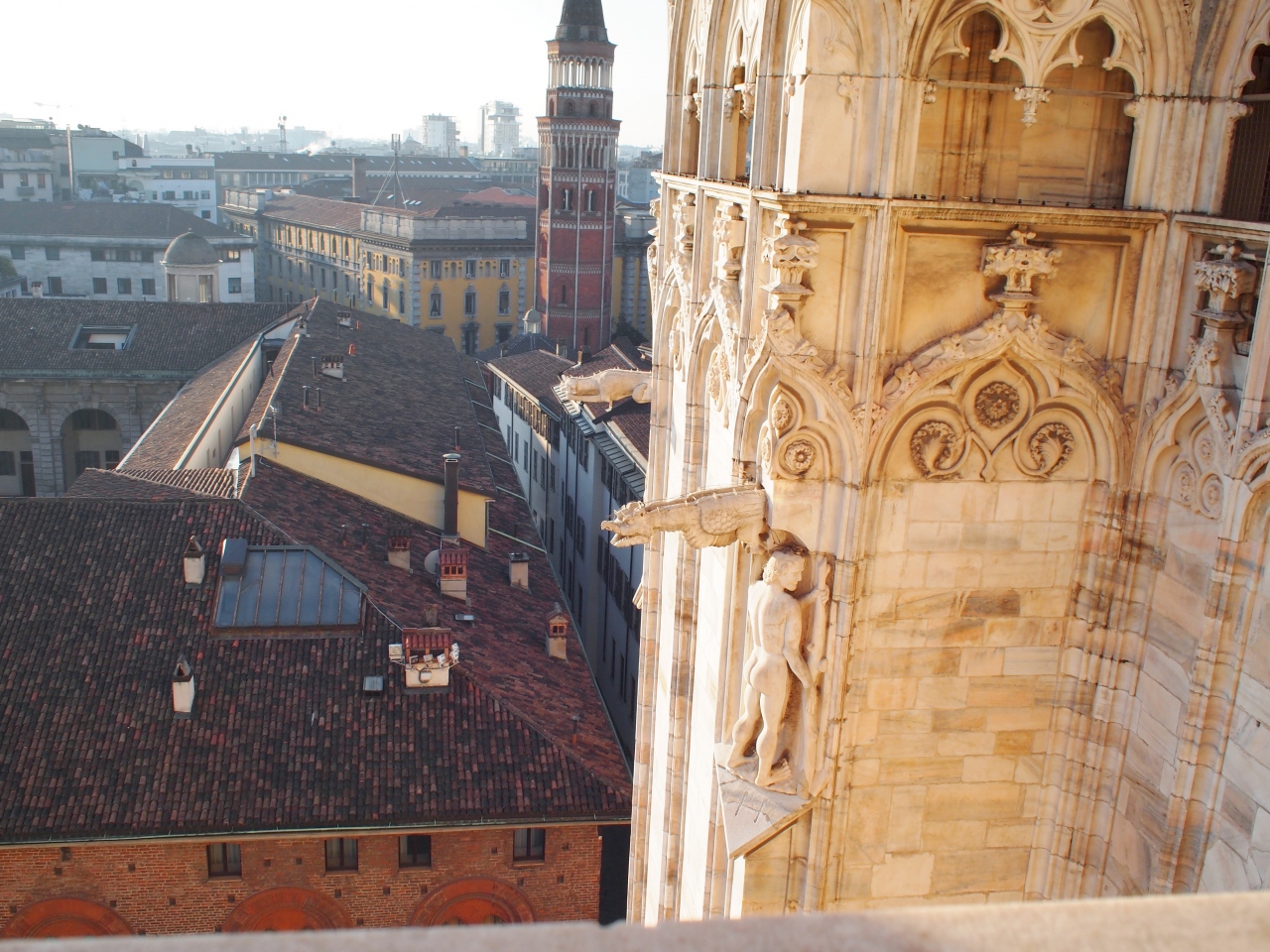 ドゥオーモの内部は写真撮影するのに3ユーロ支払わなければなりません。森を思わせる石の柱が並び立つ内部はとても荘厳な雰囲気ですが、エレベーターで上った屋上テラスも、尖塔が並び立ち、ここも森のように思われました。屋上テラスでは写真は取り放題ですが。ドゥオーモでもエレベーターでも、鞄の中身はしっかりチェックされました。