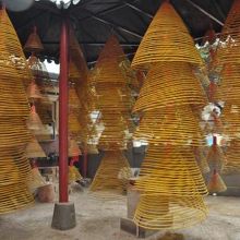 - ぐるぐる巻きのお線香が沢山ぶらさがっています