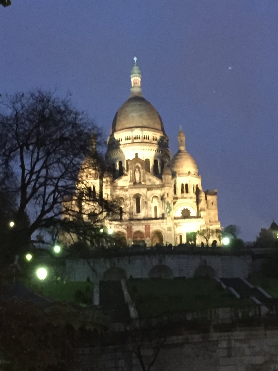 昼間のサクレクール寺院は白亜の建造物ですが、夜の寺院のイルミネーションも見る価値ありです!