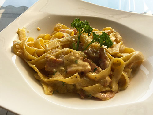 まず生ビールを注文して、食事はカルボナーラを試してみました。味のほうは、クリーミーさは良いのですが塩気がキツくちょっと残念な味でした。これ一品だけで評価することはできませんが、ここは他の美味しいレストランで食後をした後にビールやカクテルを飲みに行くのがいいかなと思いました。また、カフェ・コーナーもあり、コーヒーだけでも景色をエンジョイできます。
