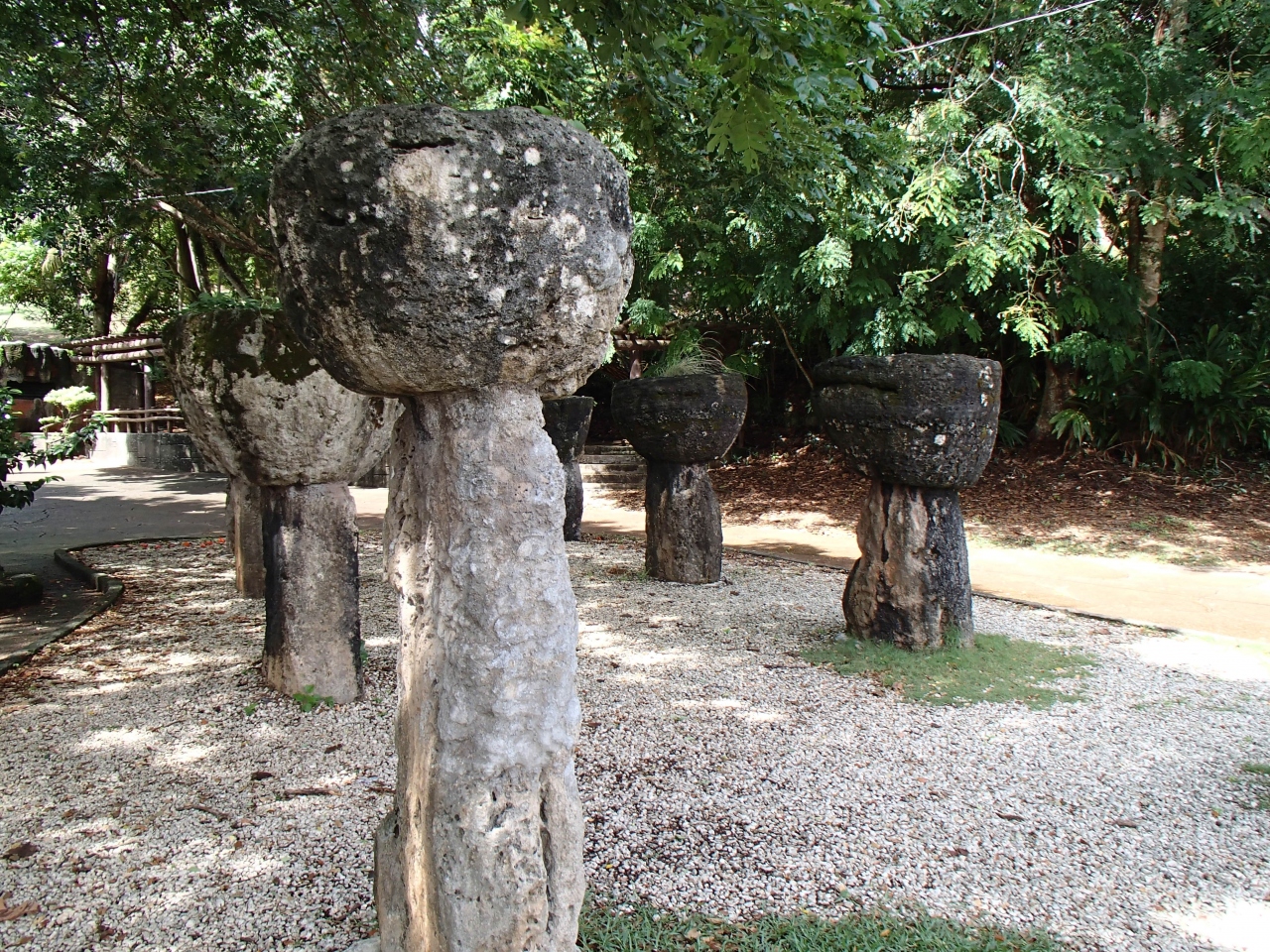古代チヤモロ文化の遺跡で、サンゴ石でできた石柱群です。直立した石にお椀型の石がのった不思議な遺跡です。パワースポットのようでした。公園自体は広くありませんが、近くには小さな防空壕などの観光スポットもあります。