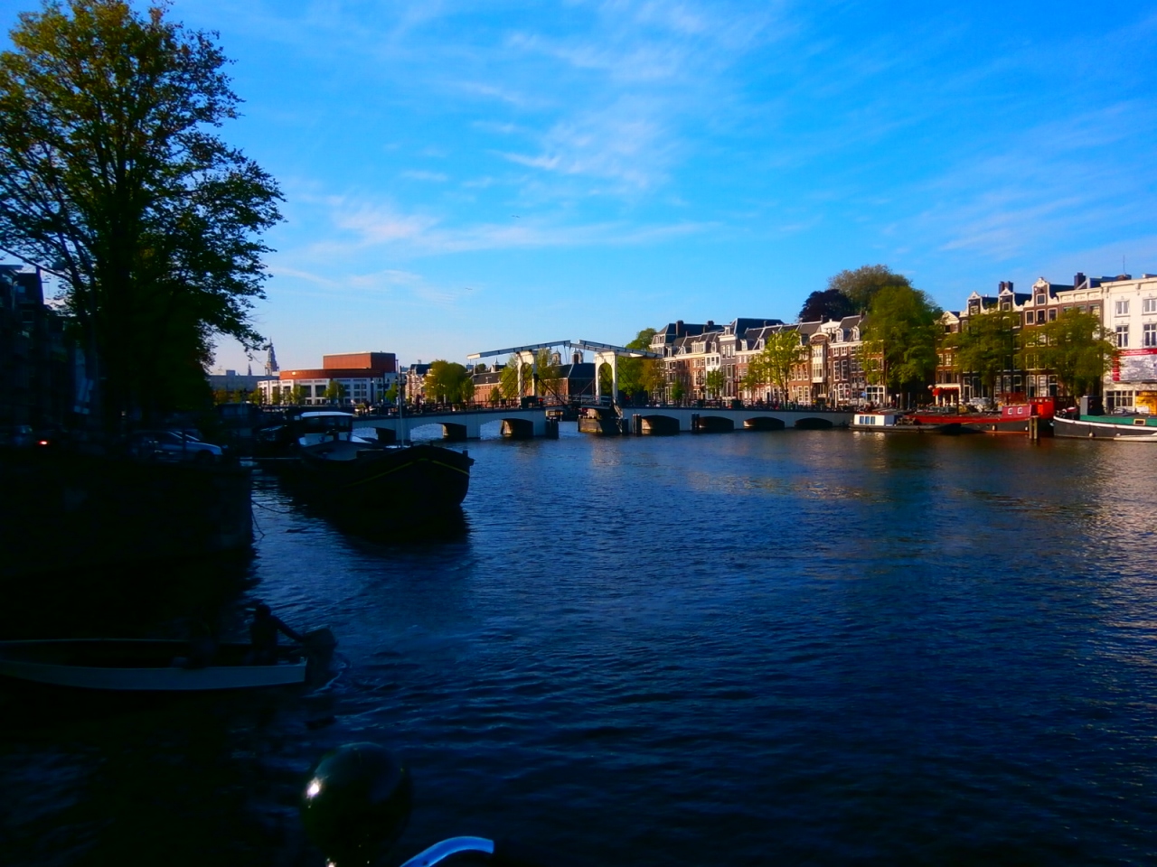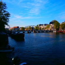 アンネフランクの家から運河沿いをずーっと歩いていきました。かなりの距離がありますが、歩けない距離ではありません。大きな運河にかかる白い木造の橋がここです。かなり開放感がある運河で、近くにはアムステルホテルなどもありました。