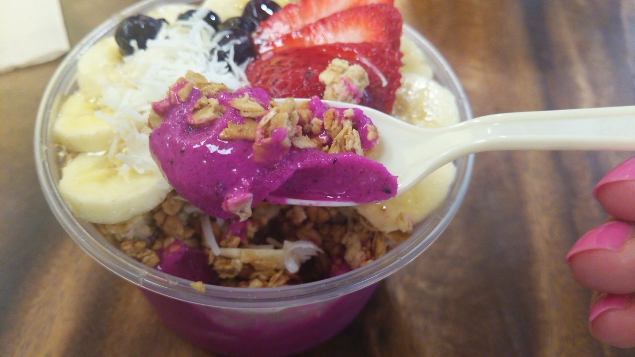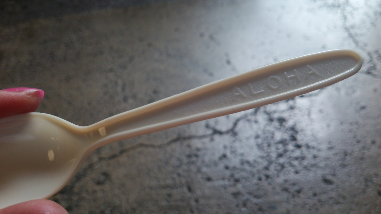 ピタヤボウルが食べたくて、ラニカイジュースに来ました。感想は…「感動!」アサイよりさっぱりしていますが、ハワイでは色々食べたいものがあり、日本にいるときよりも何倍も食べるので、私の胃袋には負担少なめ、ちょうど良い甘さでとっても美味しかったです。そして、スプーンに注目!「ALOHA」の文字が(*^^*)持って帰ろう~(笑)
