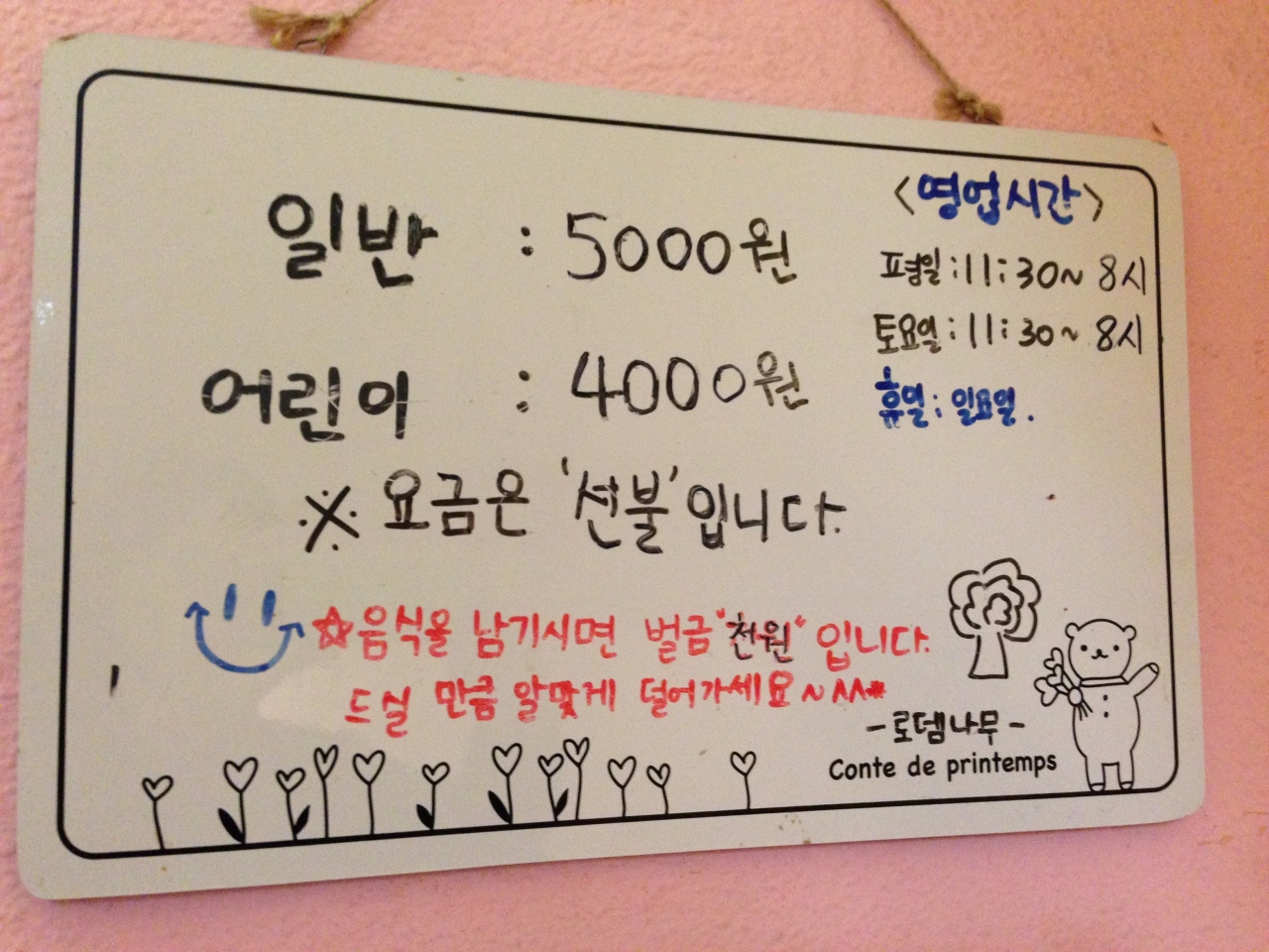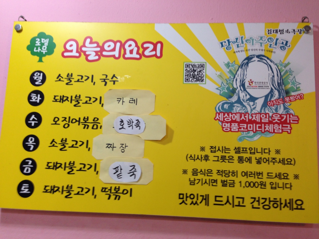 5000wを払って座り、店内を見ると曜日のメインメニューが書いてあり、訪れた火曜日はテジプルコギとカレーでした。