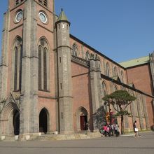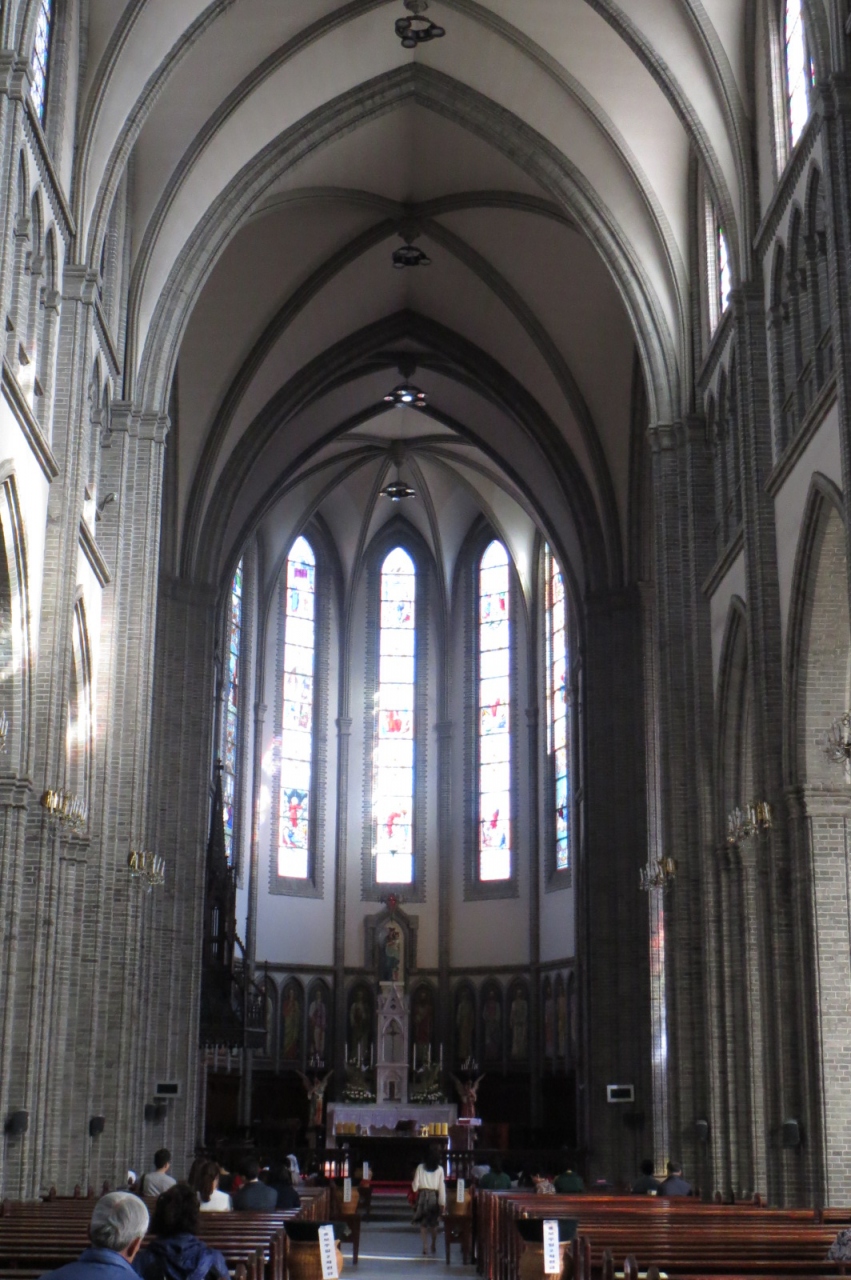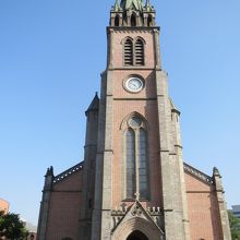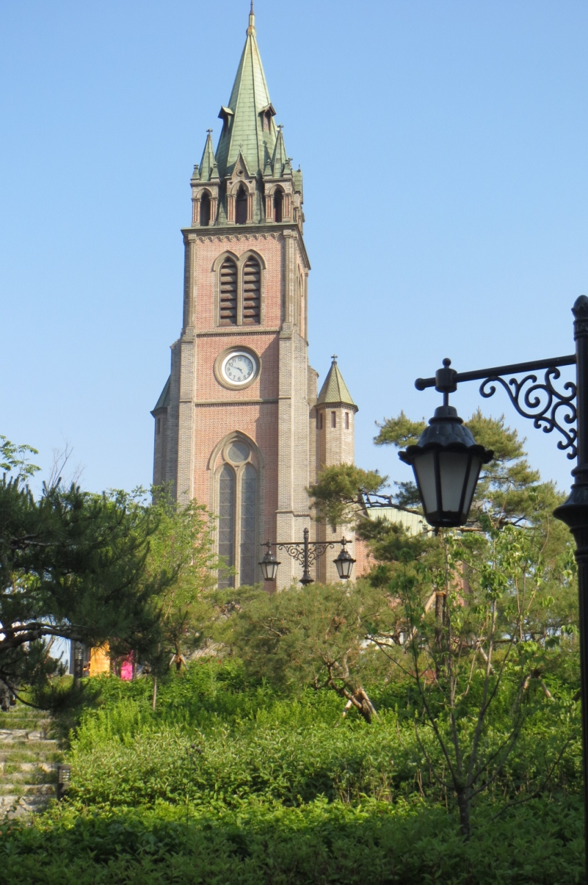 史跡第258号に指定されている「明洞聖堂」は、韓国最初の煉瓦聖堂で、韓国カトリック教会の象徴でもあります。外観は、装飾的な要素を排除した純粋なゴシック様式。細く尖った屋根を持つ背の高い時計塔と、レンガ造りの外壁が印象的です。このレンガは、一見すると赤い色と灰色の二色のようですが、実はちょっとずつ色合いの違うものが数種類使われていて、その美しさを強調しているトコロがポイント。また、この大聖堂の平面は(上から見ると)ラテン十字架形になっており、本堂の高さは23m、鐘塔の高さは45mあります。