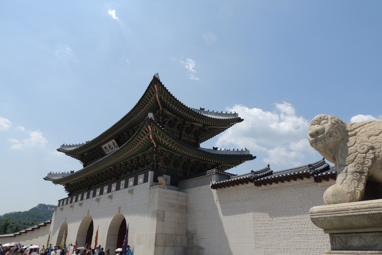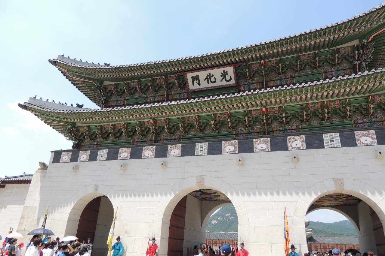 景福宮の正門です。文禄の役と朝鮮戦争で焼けたものが復元されたものです。門の前では守門軍に扮した方々が立っており、時間になると交代の儀式的なイベントも行われるので、その時に遭遇したらラッキーかと思います。夜には綺麗にライトアップされるので、お昼と夜の顔を両方見る事をお勧めします。
