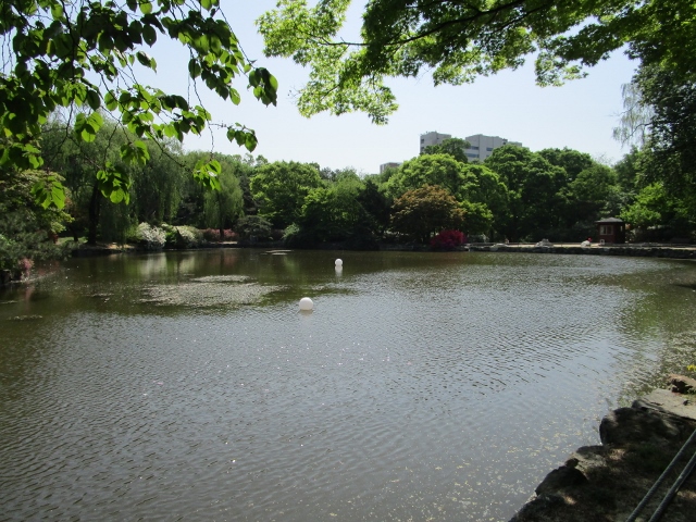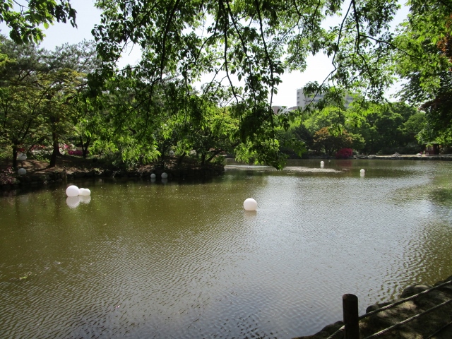 夜間開放が行われている時期にあたったので、池には変なものが浮いており、夜にライトがついたときにはきっときれいなのでしょうが、昼に見ると何とも珍妙。
