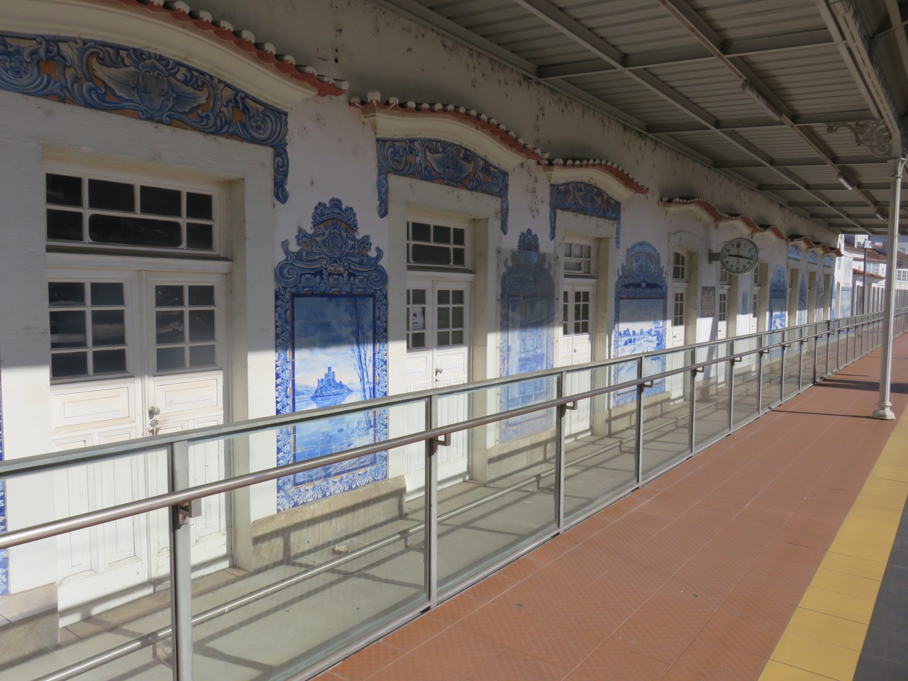 正面外壁とホーム側の壁には、アベイロの街や建造物、