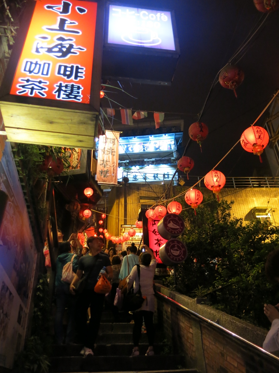 九フンの代表的風景。いつ行っても人でいっぱいですが、特に提灯に灯りが灯る夕方は混雑しています。狭い階段で皆一様に立ち止まって撮影するので、とても危ないです。人の少ない朝一か夜にゆっくり歩くのがお勧めです。