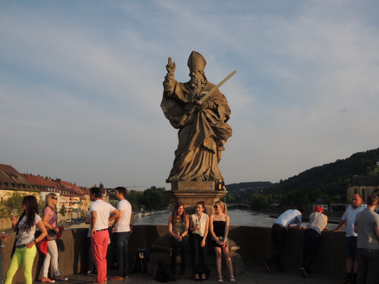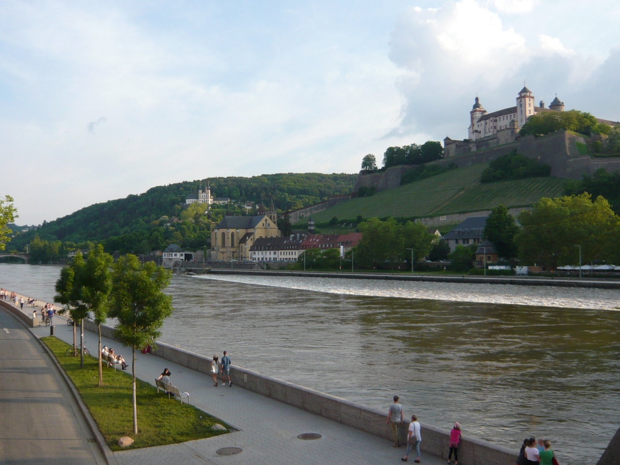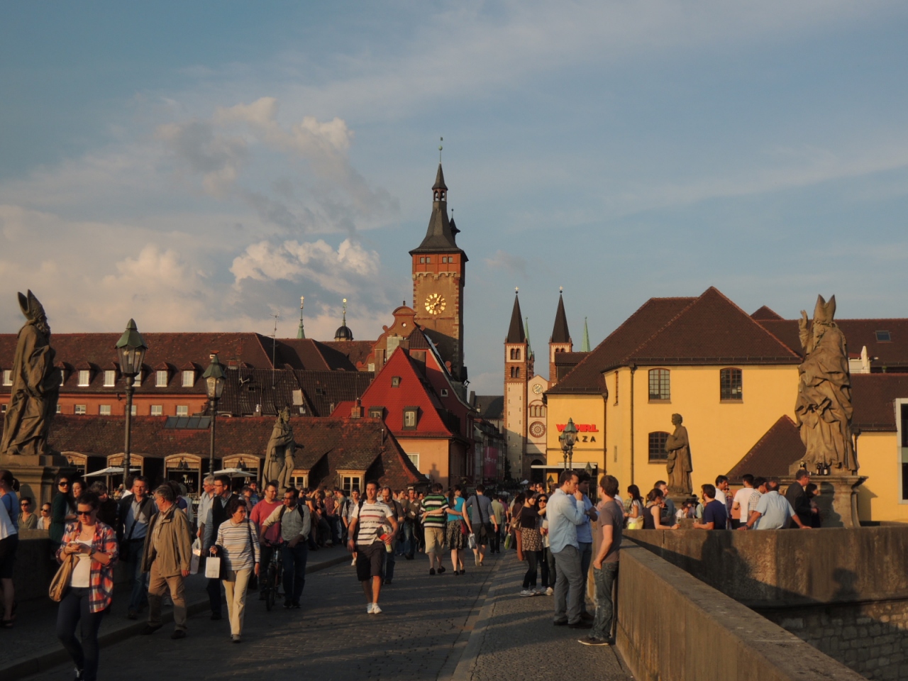ロマンティック街道の北の起点であるヴュルツブルクは、マイン川の両岸に開けた教会の多い古都で、川にかかるアルテマイン橋の欄干には12体の聖人像が立っています。橋の上から東を見るとラーツハウスの時計塔とその右に大聖堂の2本の尖塔が見え、対岸には右にマリエンベルク要塞と左の中腹にケッペレが見えます、ここは絶好の撮影ポイントです。アルテマイン橋はいつもすごい人、人。皆ワイン片手におしゃべりに余念がありません。