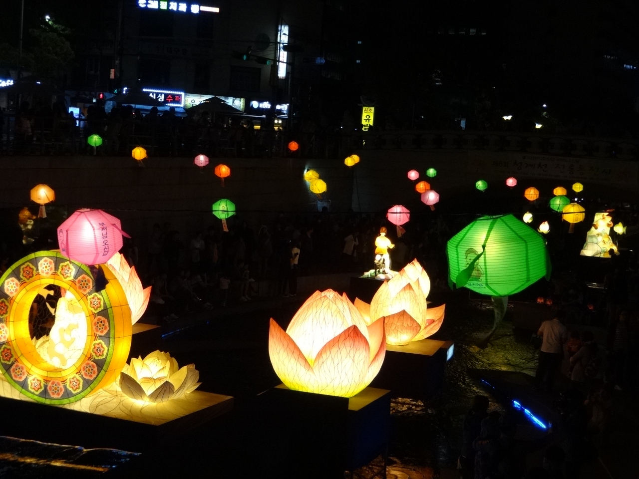 花祭りのオブジェがたくさん飾られていました。オブジェのある川のほとりは人であふれていたので、オブジェのないところで川におりました。下から見上げる提灯は、明かりが灯りとても綺麗でした。夜の川べりは風が通るので少し肌寒く上着を用意した方がいいです。